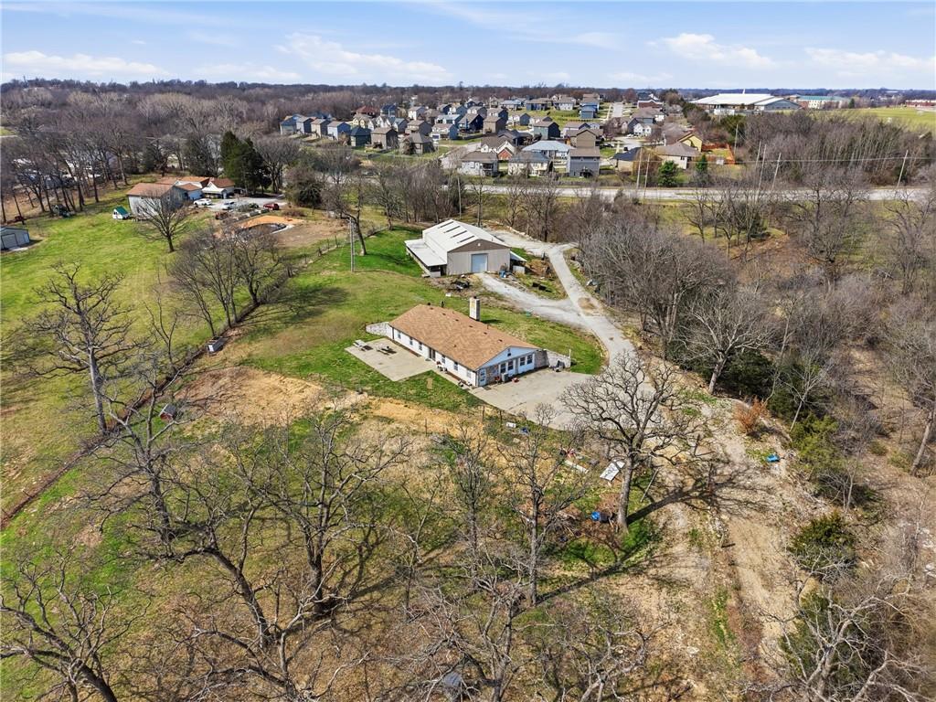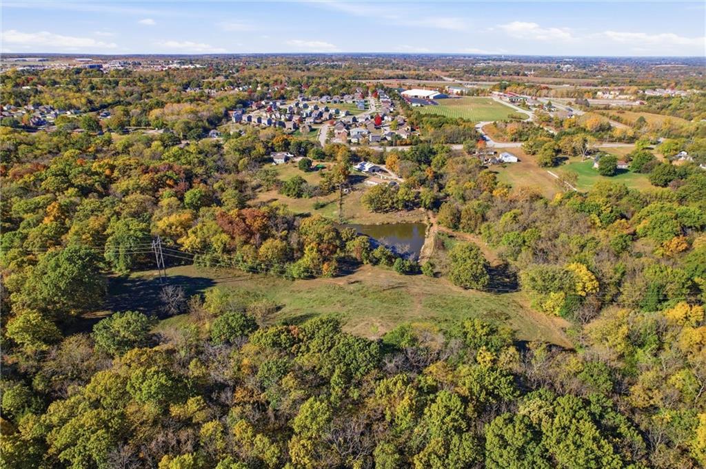 LOCATION LOCATION LOCATION! Discover an incredible opportunity on 11.64 acres in the heart of the legends. This 1-bed, 2-bath ranch offers an open floor plan with a cozy fireplace and a large bonus room, providing plenty of space to add additional bedrooms or customize to your needs. Home offers great potential and is ready for your vision and updates or ready for you to build your dream home! Enjoy wooded acreage with a beautiful large pond and peaceful, scenic views at the back of the property. Partially fenced with room to explore, create walking trails, or simply enjoy nature. A spacious outbuilding offers great storage or workshop possibilities. No flood insurance required All of this just minutes from shopping, restaurants, highway access, and less than a mile from the legends and Amazon—plus located in the highly sought-after Piper School District. A rare chance to create your dream home, enjoy acreage, and even have animals, all while staying close to city conveniences.