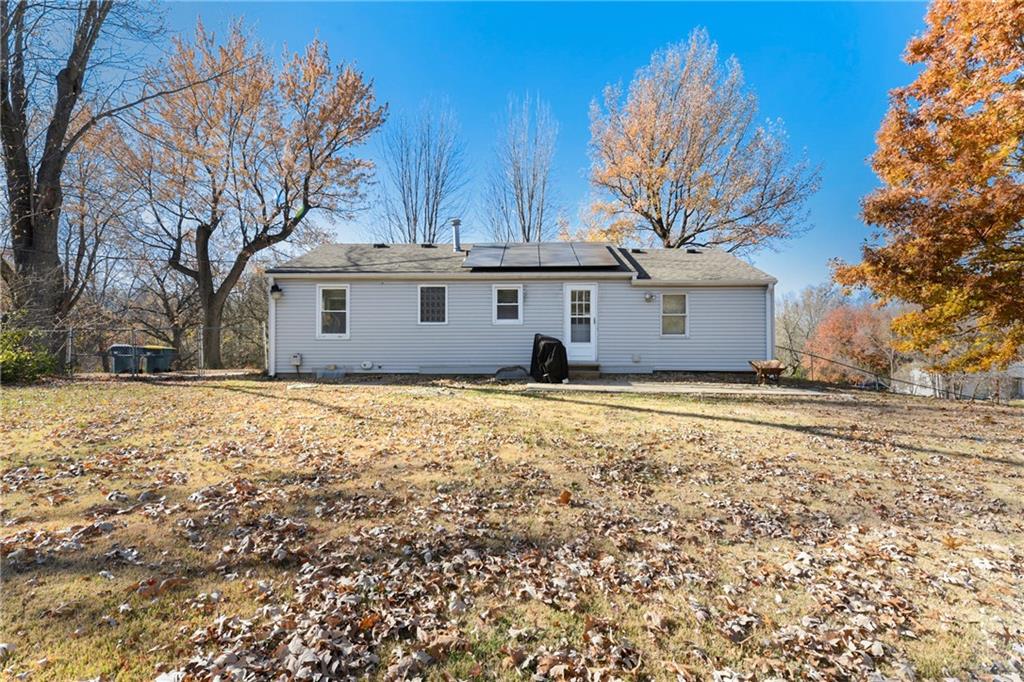 Fall in love with this tastefully renovated house, featuring 2 bedrooms and 1 full bath, 1 car garage, and a full unfinished basement with growth potential. The home has been upgraded with various energy conscious improvements, including solar panels connected to the grid for low energy costs year-round! Enjoy the nearly 1/2 acre lot, nestled within this peaceful, closed-loop community, near the Legends and western KCK business district. Nothing to do but to move right in!