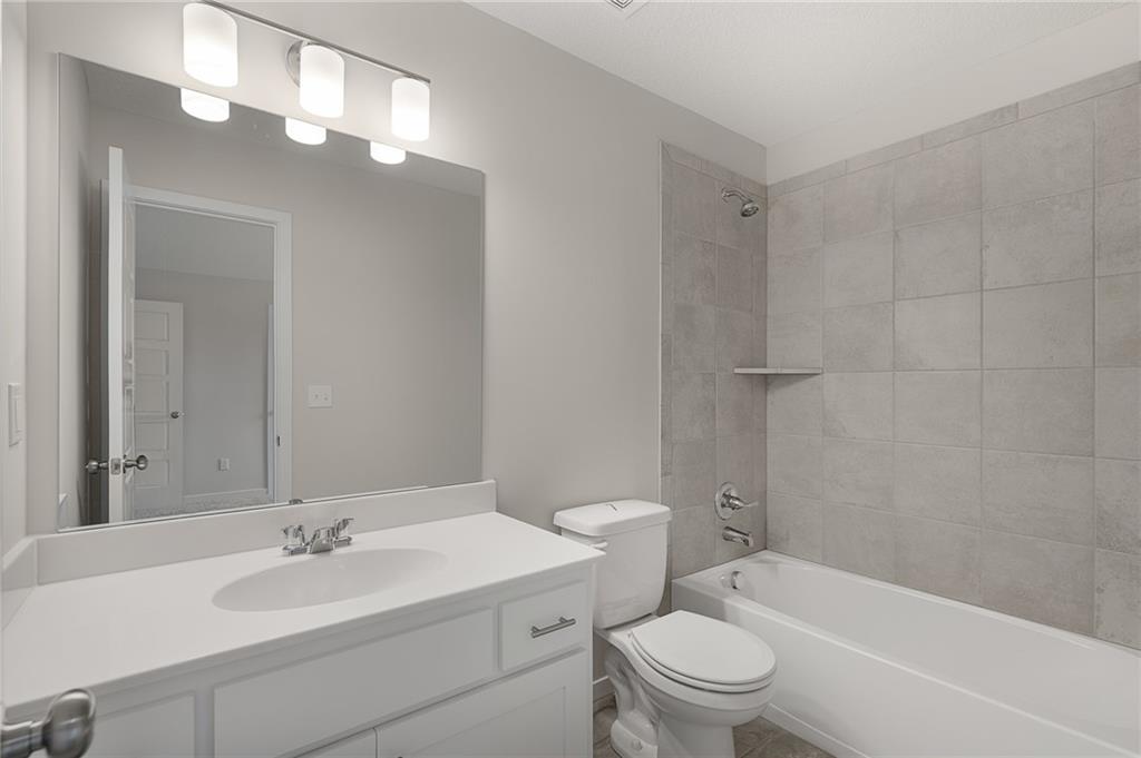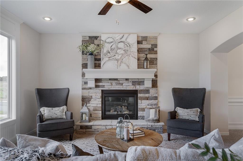 Levi II - Front Porch. This home is one of Prieb's most popular floor plans and features a large island in the kitchen and painted cabinets. There is a flex room on the main floor off the kitchen perfect for a home office with a full bathroom located close by. A stone fireplace in the great room and open floor plan are favorite features of this home. The primary bedroom has a huge primary bathroom with double vanities and granite countertops, separate shower and tub, and large walk-in closet. The laundry room is conveniently located next to the primary closet. The 3 secondary bedrooms upstairs are all spacious and have direct access to a bathroom. Home could close in 45 days or less.