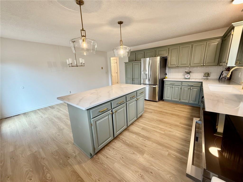 Kitchen with stainless steel appliances, a center island, hanging light fixtures, and green cabinetry