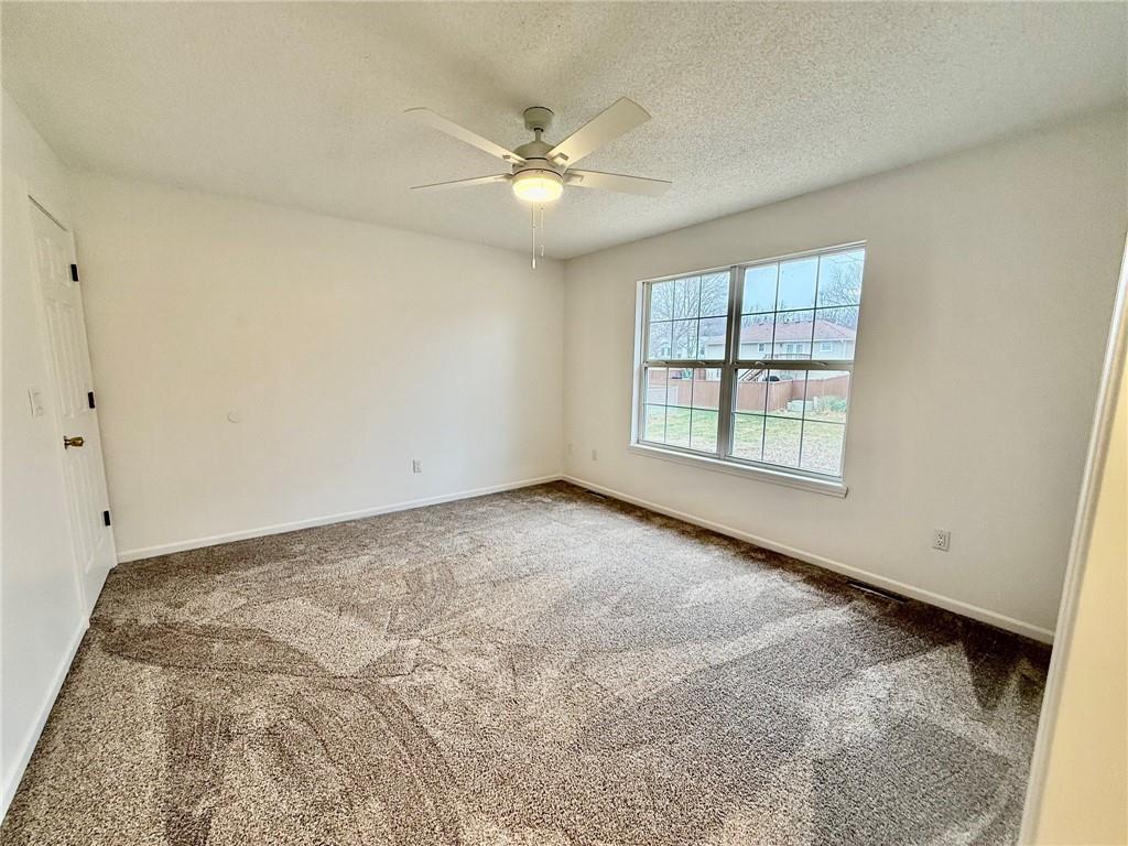 Carpeted empty room featuring a textured ceiling and a ceiling fan