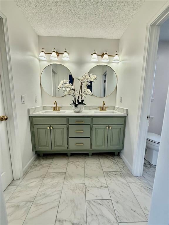 Bathroom featuring double vanity, light marble finish floors, and a textured ceiling