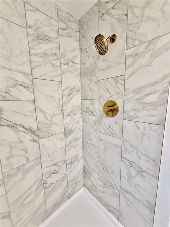 Full bath with vanity, light marble finish floors, and tub / shower combination