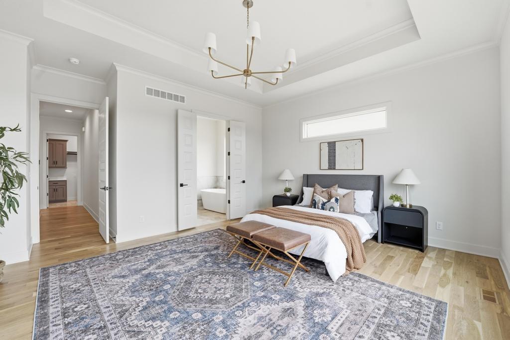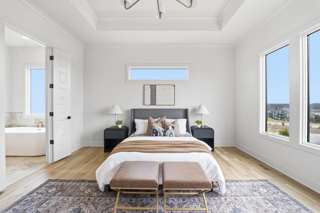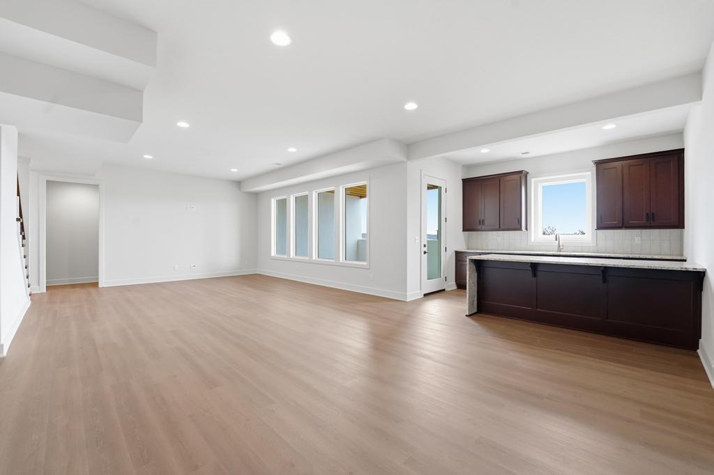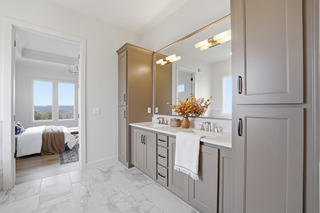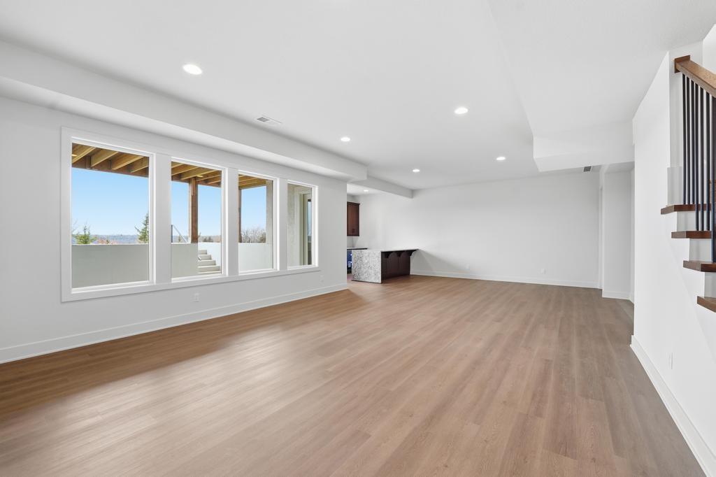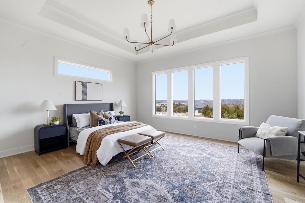 The stunning Emerson reverse 1.5 story plan by French Homes in Cedar Creek's newest community - The Estates of Canyon Oaks. Located in the award-winning Olathe School District, this reverse 1.5 story home has 4 beds, 3.5 baths, 3 car garage and sits on a walkout lot on a cul-de-sac. Step inside the double wide doors into the entry which leads you to the spacious family room with wood floors and fireplace with built-in cabinet surrounds. The gourmet kitchen features an island, custom cabinets with hood, cooktop, built in oven/micro and a generous sized prep pantry with storage, sink and beverage cooler. The eat-in dining space has a built-out space perfect for a hutch and also connects to the covered deck - perfect for morning coffee. The private main level primary suite offers a spa-like bathroom that includes double vanities, free-standing tub, shower with bench and a huge walk-in closet that conveniently connects to your laundry room. Main level also has a second bedroom, full bath and a mudroom with bench off the garage. The walkout lower level includes a large rec room with second fireplace, wet bar with island and two additional bedrooms, 3rd full bath and a half bath perfect for guests. Plenty of unfinished storage space left too. Enjoy Cedar Creek's amazing amenity package that includes 3 neighborhood pools, community clubhouse with exercise room and indoor basketball court, lit pickleball and tennis courts, access to 65 acre lake, monthly neighborhood events, walking trails and more.