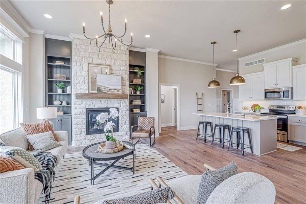 The award-winning and highly desired Stratford plan by SAB Homes will be move-in ready late February to early March on Lot 85 in The Enclave at Boulder Hills. This beautifully designed reverse 1.5-story villa offers 3 bedrooms and 3 baths with an inviting open-concept main floor. The great room features a cozy fireplace and a wall of windows for natural light. The covered patio is perfect for enjoying all four seasons. The kitchen includes an island, custom cabinetry, a pantry, and an adjoining dining area for easy entertaining. The main-floor primary suite offers double vanities, a walk-in shower, and a generous walk-in closet. Completing the main level are the laundry room and a second bedroom with full bath. The finished lower level includes a third bedroom, an upgraded shower bath, and a spacious family room. The exterior features lap siding and stone accents. Enjoy a carefree lifestyle in this maintenance-provided community with lawn care, irrigation service, and snow removal for $198/month. Annual $900 HOA includes access to resort-style amenities: pool, fountains, outdoor kitchen and fireplace, pickleball court, putting green, clubhouse, and playground. The neighborhood sits directly across from Heritage Park.