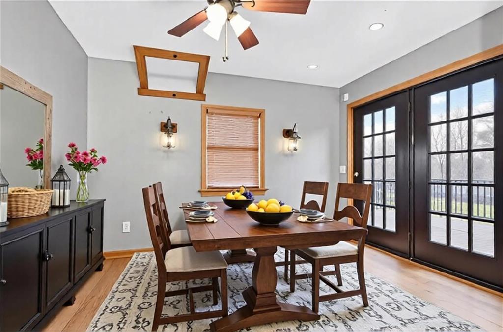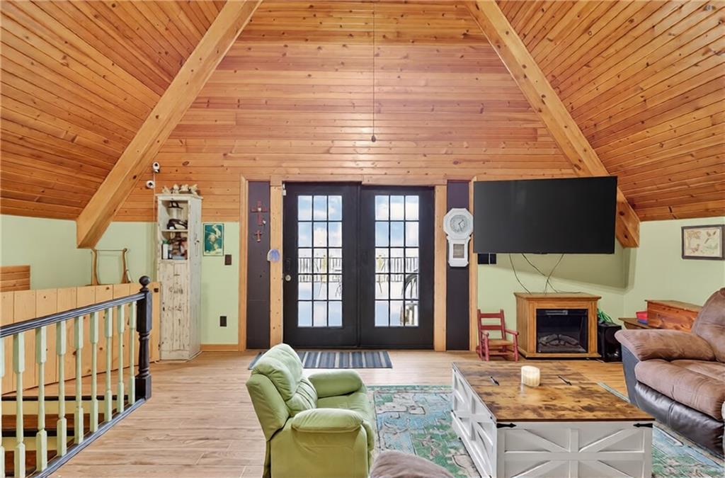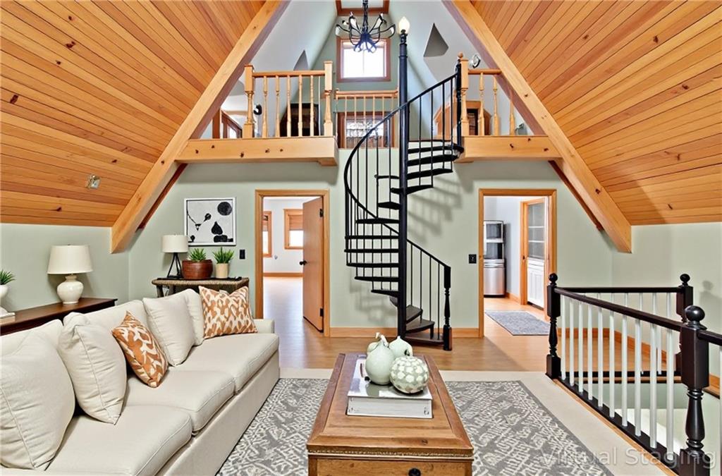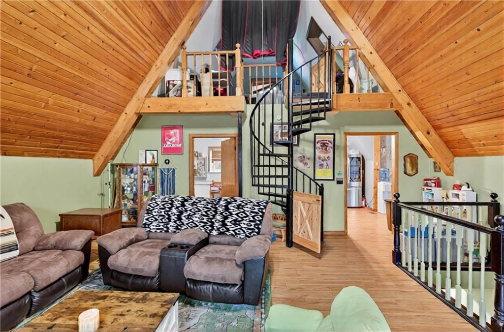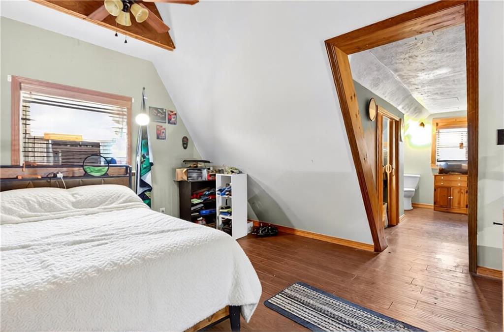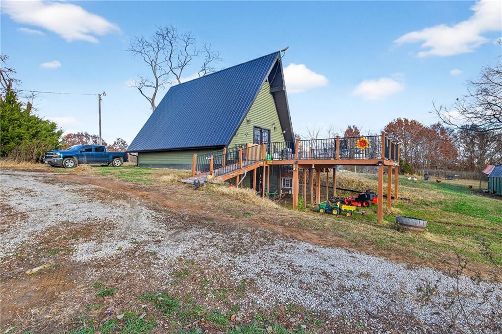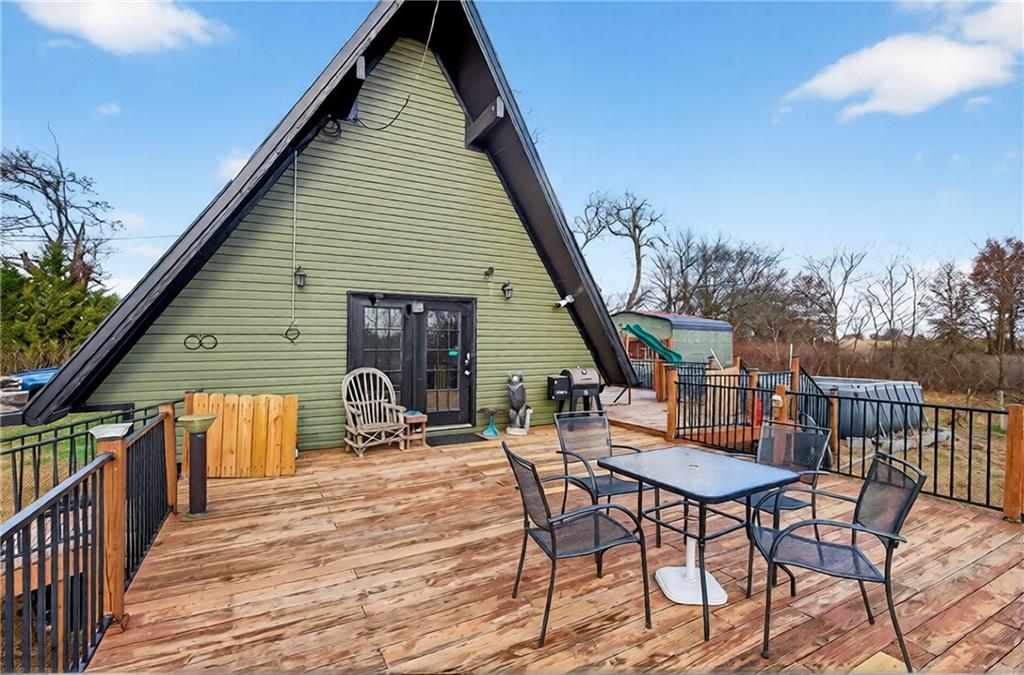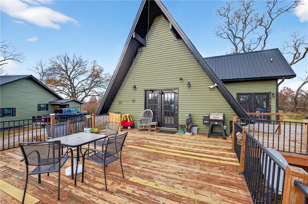 Experience A-frame charm combined with modern improvements across this 1.9-acre property that includes a full guest house and inviting outdoor amenities. A great setup for multi-generational living or extra space. Located in a convenient rural corridor between Nevada, Missouri and Fort Scott, Kansas. The primary A-frame style home, built in 1992, offers 1,484 sq. ft. with a warm and inviting loft layout. As you enter, you’re greeted by a striking vaulted wood ceiling and an open living space filled with natural light. The kitchen sits just off the living room and includes updated appliances, making daily living and entertaining a breeze. This home offers 2 bedrooms, 1 non-conforming bedroom, and 2.5 bathrooms. The main-level primary suite provides comfort and privacy, while the finished walkout basement adds versatility for additional living space, guests, or hobbies. Step outside and enjoy a large deck overlooking the above-ground pool, plus a charming firepit area complete with swinging benches — a perfect setting for quiet evenings or gathering with friends and family. The acreage features peach trees, pear trees, grape vines, and blackberry bushes, adding to the peaceful rural appeal.An added bonus is the 840 sq. ft. guest house, offering 2 bedrooms, 1 non-conforming bedroom, and 1 bathroom — ideal for guests, extended family, or potential rental income. Major improvements in recent years include: Central heat & air, Newer metal roofs on both homes and all outbuildings, Newer siding on both homes,Newer windows and doors, Newer flooring, Newer well water filtration system. And if it sweetens the deal…the owners are even willing to leave the chickens — cluck, cluck! Important Note: The sellers lead a very busy lifestyle. To help buyers envision the layout and potential, some rooms have been virtually staged. The virtual staging is simply provided for convenience and visualization.