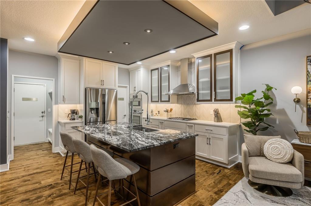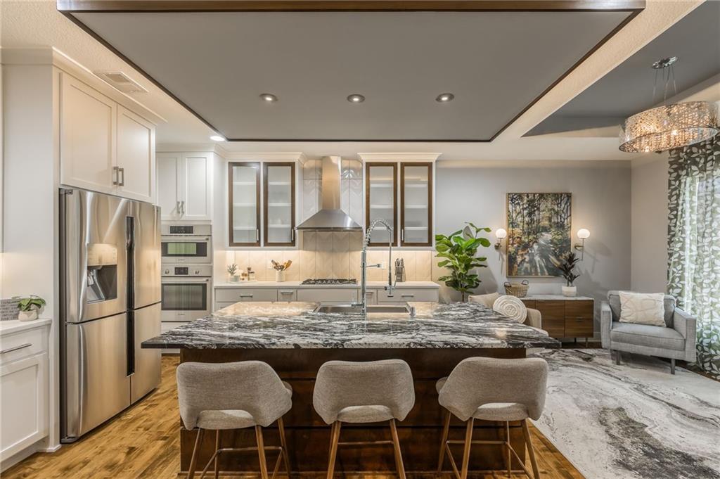 OUTSTANDING, Reverse 1.5 Story is nestled in Overland Ridge in Kansas City North. This fine home provides open living spaces with 4 bedrooms (2 on the main floor and 2 on the lower level) & 4 bathrooms, large kitchen meant to please the finest of cooks, custom cabinets, expansive granite breakfast island, deep stainless sink, Bosch range, oven, dishwasher and a walk-in pantry complete the kitchen. The dining area flows directly from the kitchen to the living room with 14 ft. ceilings, beautiful maple wood floors with a folding wall of windows opening to a screened in deck with fireplace with views of the in ground pool. The Owner's bedroom offers a large window also overlooking the private pool and backyard. The Primary bedroom has it's own access to the screened deck-- the master ensuite holds a wet room with a combined sunken jetted tub and shower, double bachelor height vanities, large walk-in closet that connects to the laundry. Designed for comfort and entertaining, the lower level has a tv area, wet-bar with tiled backsplash. You can take a break from the day by walking out to the patio. Other Amenities include recessed lighting, chandeliers, granite counters, 3-car garage, 2 gas fireplaces and large storage area. Overland Ridge neighborhood is conveniently located near interstates, shopping venues, health care facilities, restaurants, gyms, schools, parks, evening entertainment and the KCI Airport.
