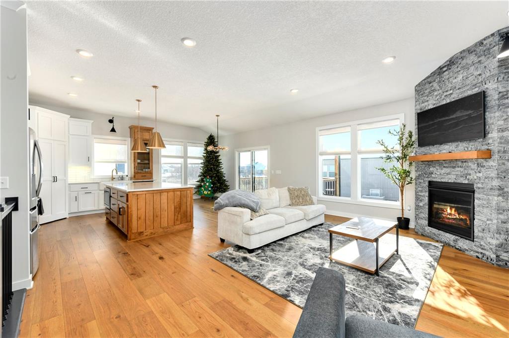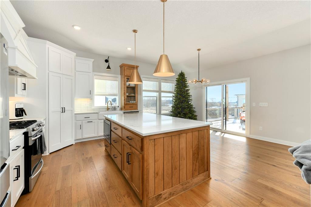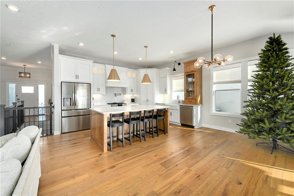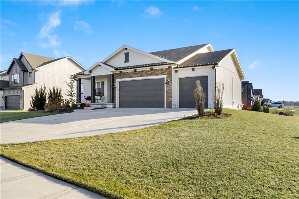Immaculate 2-year-old Reverse Ranch on a premium corner lot featuring a modern open layout, upgraded finishes, and exceptional indoor/outdoor living spaces. This former model home showcases a spacious great room with floor-to-ceiling stone fireplace, large windows for abundant natural light, and engineered hardwood floors throughout the main living areas. The designer kitchen includes quartz countertops, large center island w/ seating, upgraded trim, Gas Range w/Convection, pot-filler, stainless appliances, farmhouse sink, brushed brass fixtures, glass-door display cabinetry, and subway tile backsplash. The dining area flows seamlessly to the covered deck overlooking the fenced backyard. The primary suite offers a tray ceiling with wood plank detail, large windows, and a spa-inspired bath with dual quartz vanities, upgraded lighting, a walk-in tile shower with bench, herringbone accent wall, and matte black fixtures. The oversized walk-in closet connects conveniently to the laundry and mudroom w/ built-in drop zone. Additional main-level bedrooms include upgraded lighting & modern wall accents along with attractive wood finishes in the vanity and matching mirror. A second full bath features contemporary vertical tile and updated finishes. The finished lower level provides a generous second living area with recessed lighting, plush carpet, & a wet bar with custom backsplash. Additional bedroom & full bath offer flexibility for guests or extended living arrangements. The unfinished portion is plentiful too, providing value add for future finished space or great storage as it sits. Outdoor features include a covered deck, fully fenced yard with wrought iron fencing, and ample space for recreation. The climate-controlled garage is ideal for storage, hobbies, or year-round comfort. Additional upgrades include premium lighting throughout, wainscoting and trim accents, energy-efficient windows, & a clean modern color palette. Move-in ready and well maintained.