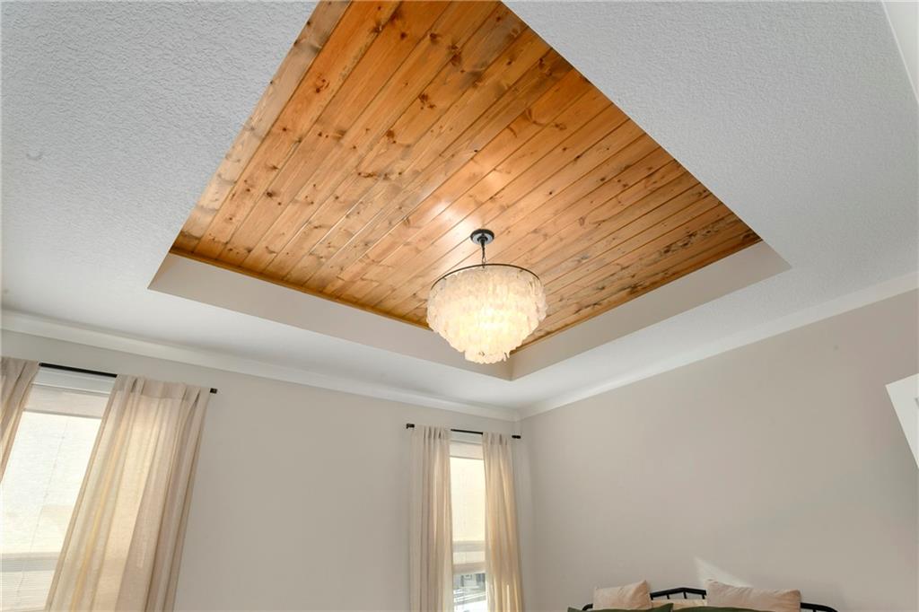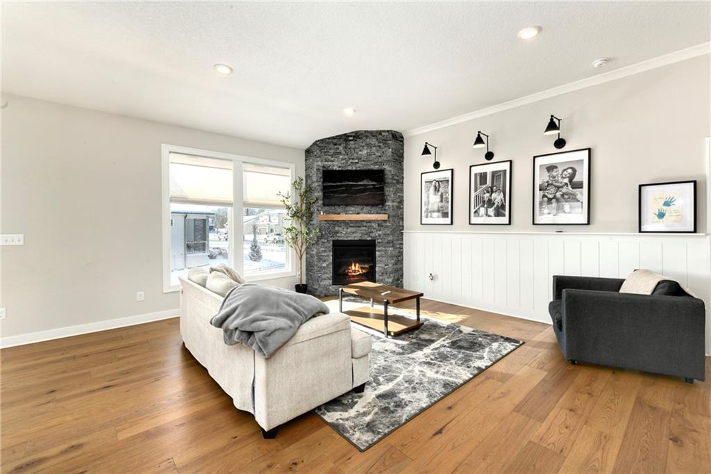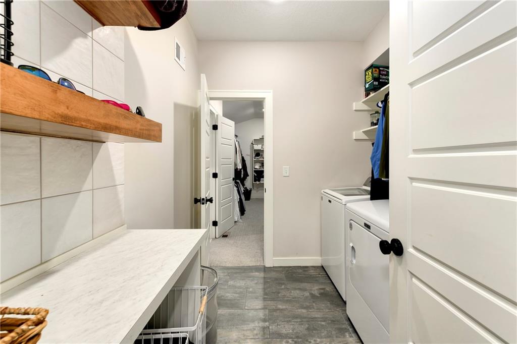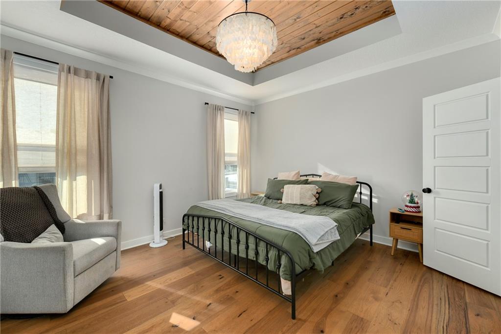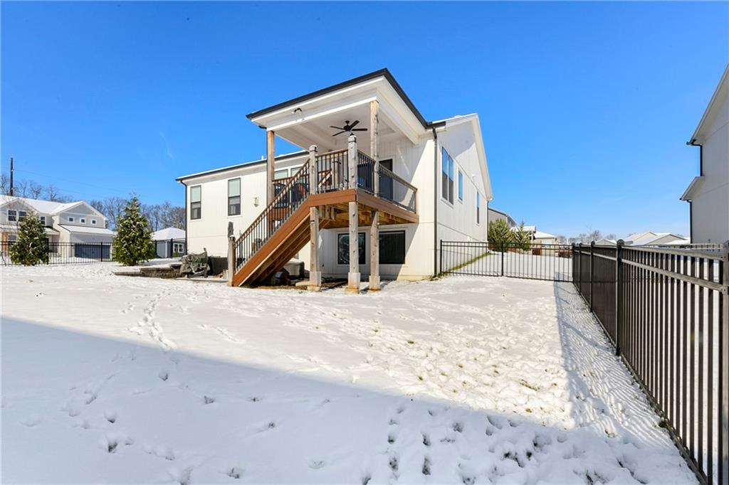 Immaculate 2-year-old Reverse Ranch on a premium corner lot featuring a modern open layout, upgraded finishes, and exceptional indoor/outdoor living spaces. This former model home showcases a spacious great room with floor-to-ceiling stone fireplace, large windows for abundant natural light, and engineered hardwood floors throughout the main living areas. The designer kitchen includes quartz countertops, large center island w/ seating, upgraded trim, Gas Range w/Convection, pot-filler, stainless appliances, farmhouse sink, brushed brass fixtures, glass-door display cabinetry, and subway tile backsplash. The dining area flows seamlessly to the covered deck overlooking the fenced backyard. The primary suite offers a tray ceiling with wood plank detail, large windows, and a spa-inspired bath with dual quartz vanities, upgraded lighting, a walk-in tile shower with bench, herringbone accent wall, and matte black fixtures. The oversized walk-in closet connects conveniently to the laundry and mudroom w/ built-in drop zone. Additional main-level bedrooms include upgraded lighting & modern wall accents along with attractive wood finishes in the vanity and matching mirror. A second full bath features contemporary vertical tile and updated finishes. The finished lower level provides a generous second living area with recessed lighting, plush carpet, & a wet bar with custom backsplash. Additional bedroom & full bath offer flexibility for guests or extended living arrangements. The unfinished portion is plentiful too, providing value add for future finished space or great storage as it sits. Outdoor features include a covered deck, fully fenced yard with wrought iron fencing, and ample space for recreation. The climate-controlled garage is ideal for storage, hobbies, or year-round comfort. Additional upgrades include premium lighting throughout, wainscoting and trim accents, energy-efficient windows, & a clean modern color palette. Move-in ready and well maintained.