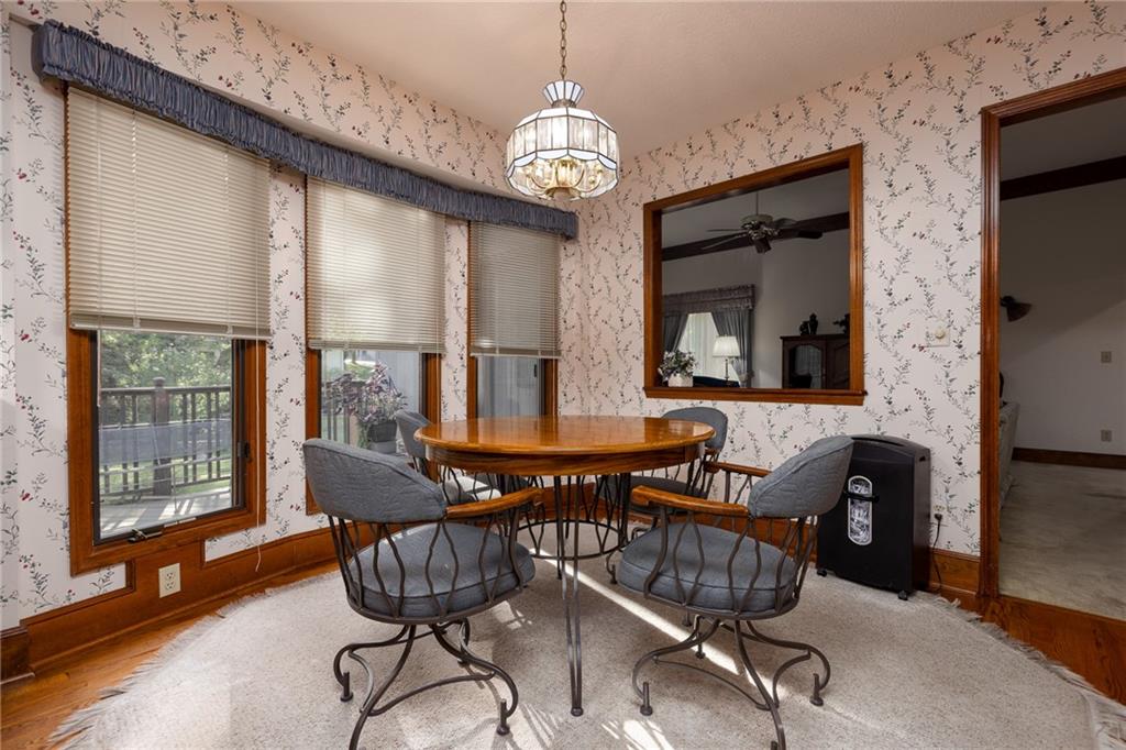 If you've always wanted to live at Weatherby Lake - now is your opportunity! This Lovely 1 1/2 Story home is just waiting for you! Beautiful corner lot (.42 acres) that's been meticulously cared for! The Pride of Ownership is evident everywhere you look. From the vaulted entry with skylight to the solid core doors everywhere (on all levels!). The Great Room features 10 ft ceilings and a beautiful WBFP with gas logs flanked on both sides by bookshelves. There's a Formal Dining room for those special occasions and a cozy eat-in kitchen/breakfast area for your morning coffee. The primary bedroom on the main level is generously sized and includes an ensuite bath with garden tub and separate shower, double vanities, & 2 walk-in closets. The laundry room is conveniently located on the main level. The upper level features a loft/sitting area and 2 large bedrooms (both with walk-in closets) and a full bath. The finished lower level offers space for a pool table/game area plus a comfortable gathering space near the 2nd WBFP! And there's still room for a large storage area and 1/2 bath. The 2 car Attached Garage includes openers and NEW doors in '24. The lower level 3rd garage is perfect for that "classic car" or just the lawn equipment and lake toys! There's a deck and patio off the kitchen to enjoy warm summer nights. The furnace is newer (2020) and the A/C was replaced in Oct '23! And the gutters are apppox 2 yrs old. This home has been loved and cared for by the original owner and it shows!! Now add to all that - the fun of living at the Lake and it just doesn't get any better!! Enjoy all that Weatherby Lake offers...swimming, fishing, community events & more! Don't miss the chance to own in this amazing Lake community!