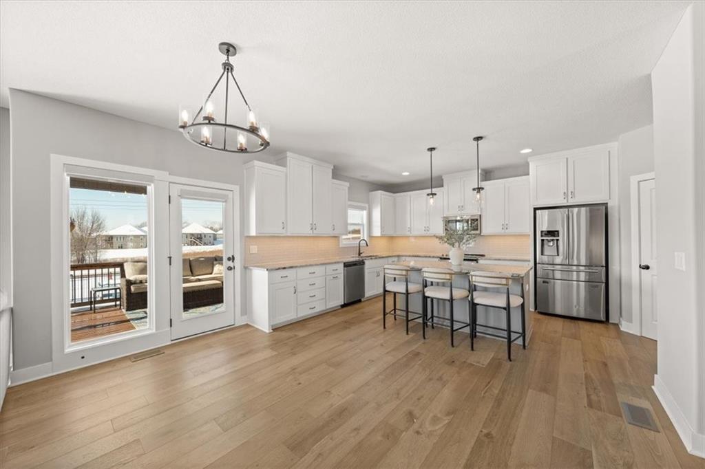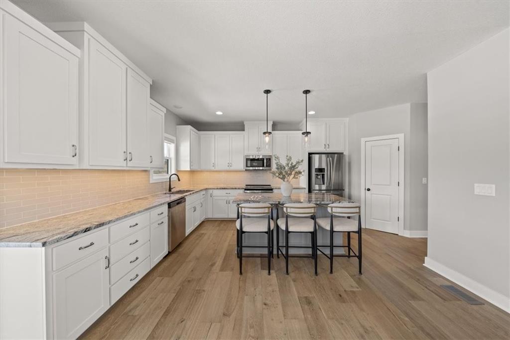 Welcome to your dream home in the highly desirable Benson Place Landing! This exquisite 2-year-old home blends the best of comfort, thoughtful design, and unbeatable location. Enjoy the feel of new but with upgrades you won’t find in current new construction. Step inside to discover an open yet defined layout, perfect for both everyday living and entertaining. Gorgeous ceiling beams accent the expansive great room, while the flexible front room, complete with wainscoting, offers space for a formal dining area, home office, or playroom. The kitchen is a showstopper, featuring a convenient coffee bar, stone countertops, and generous storage. Upgrades that truly set this home apart: Designer light fixtures throughout: modern, stylish, and energy-efficient. Beautifully landscaped yard for instant curb appeal and outdoor enjoyment. Newly installed iron rod fencing in backyard. An extended concrete patio ideal for gatherings, grilling, or relaxing. 4-car tandem garage, equipped with its own electric heater provides endless options: extra vehicles, storage, workshop, home gym, or creative space. Unwind in the sprawling primary suite with a spa-inspired bath, oversized walk-in closet, and direct access to the laundry room for ultimate convenience. Step outside to the covered 14x12 deck. Enjoy unbeatable community amenities: (2) swimming pools, splash park, playground with soccer goals, miles of scenic trails, and lush nature areas, all just steps from your door. Commuters will love the quick access to I-435, I-35, and 152 Hwy, only 20 minutes to KCI or downtown Kansas City! Don’t miss your chance to own this like-new, move-in ready home with premium upgrades and a prime Northland location.