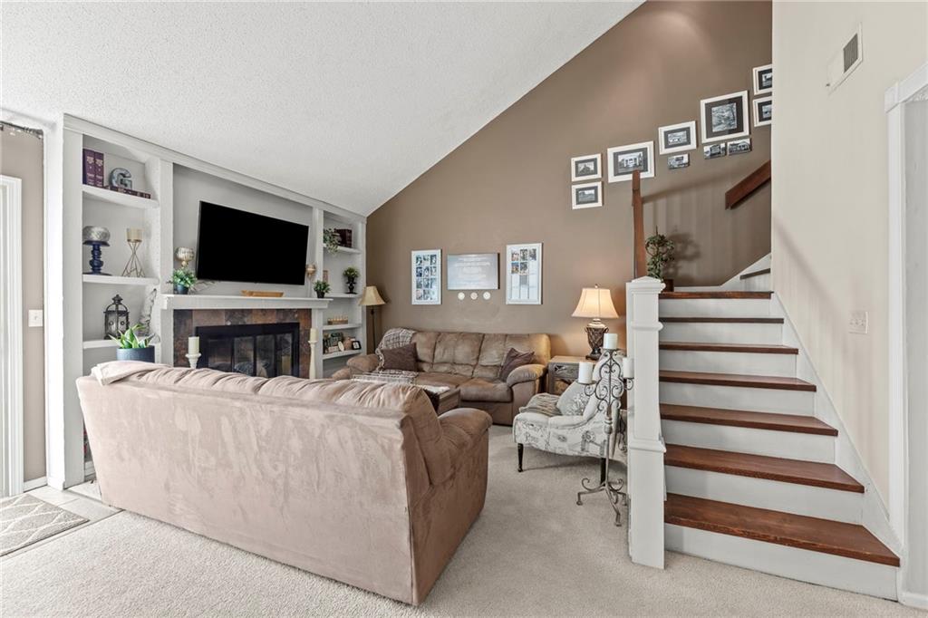 WELCOME TO YOUR MAINTENANCE PROVIDED TOWNHOME at Mission Lake—one of South Kansas City’s most charming lake-centered communities. Enjoy access to scenic walking trails, community pools, clubhouse and private lake amenities that define the Mission Lake lifestyle. Inside, discover a bright and open layout ideal for everyday living and entertaining. Living area features vaulted ceilings with abundant natural light, creating an inviting atmosphere. A cozy fireplace adds warmth and character, while the dining and living spaces flow seamlessly for modern convenience. Kitchen offers functional design with ample white cabinets and black appliances. Dining area has easy access to your private patio — perfect for morning coffee or evening outdoor gatherings. Main floor laundry with bonus pantry space! Two bedrooms upstairs provide comfort and privacy, complemented by a well-appointed bathroom and thoughtful storage. Additional highlights include an attached garage, HOA-maintained exterior and grounds and a prime location just minutes from Red Bridge Shopping Center, Martin City’s restaurants and breweries, parks, golf and quick highway access. Mission Lake provides the perfect combination of suburban tranquility with urban convenience. This townhome is move-in ready with fenced courtyard, tons of storage and TREX deck!! WELCOME HOME!