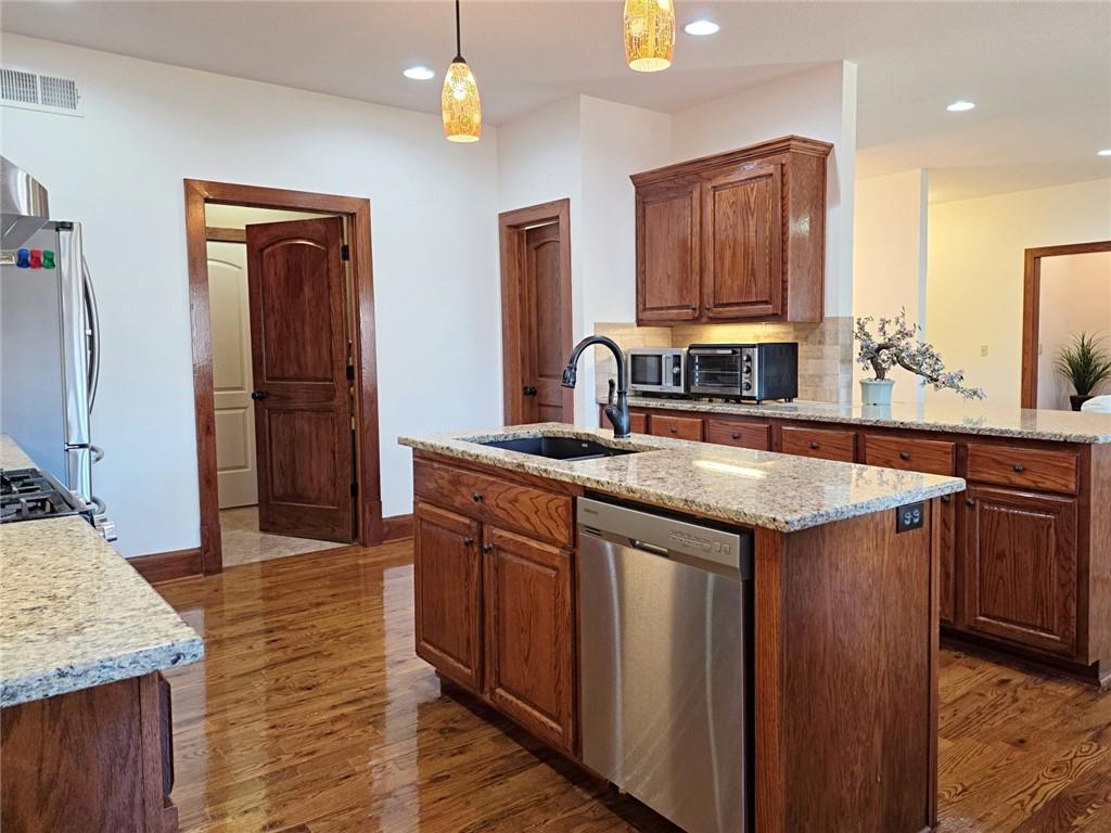 Move-in Ready and PRISTINE! This beautiful ranch home boasts a sprawling, open-concept floor plan and is perfectly situated in a peaceful cul-de-sac setting. The heart of the home is the spectacular, oversized Chef's Kitchen, featuring gleaming granite countertops, tons of cabinetry, and a walk-in pantry, which flows seamlessly into the dining and expansive living room—ideal for entertaining! Enjoy the convenience of main-level living with a laundry room and a desirable secondary bedroom/full bath on the main floor. The fully finished, daylight walk-out basement dramatically expands your living space, offering two additional bedrooms, a full bathroom, a large family room, and spacious storage. As a fantastic bonus, the additional non-conforming room is the perfect versatile space for a dedicated home theater, exercise studio, or private office! Don't miss this opportunity.