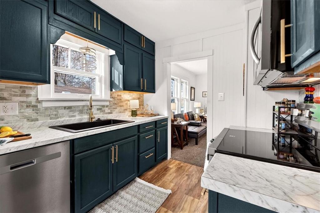This renovated 3-bedroom home with a finished attic bonus room is bright, open, and ready for its next owner. The main living area features a new electric fireplace with built-ins, new flooring, and upgraded storm windows that bring in great natural light. The kitchen has been fully updated with new cabinets, sink, fixtures, waterproof flooring, and all-new appliances that stay with the home. The bathroom includes a new tile floor, vanity, and toilet. Additional updates include a new high-efficiency HVAC system, professionally cleaned air duct vents, new hot water tank, new gutters, new breakers, outlets, light fixtures, and a new back deck. New carpet runs throughout the home, and a dedicated laundry area has been added in the basement. A new back door and storm door, exterior paint, gutters, and gravel driveway complete the exterior improvements. This home also qualifies for 0% down payment programs, creating a strong opportunity for buyers. Homes with this level of work and pricing do not last!