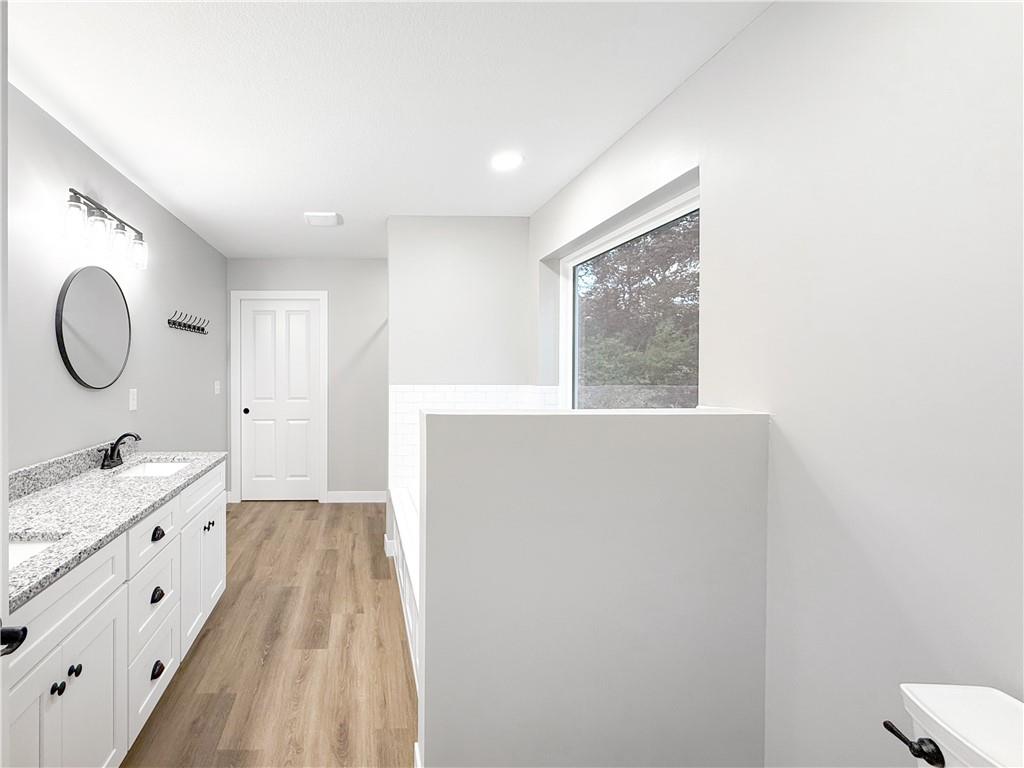 This stunning new-construction barndominium offers modern living with incredible function and style. Step inside to an open-concept layout filled with natural light, luxury vinyl plank flooring, recessed lighting, and serene country views. The gorgeous kitchen features crisp white cabinetry, granite counters and stainless steel appliances. A private primary suite includes a spa-inspired bathroom with dual vanities, a soaking tub, walk-in shower, and a large custom walk-in closet with built-in shelving. Additional bedrooms are bright and comfortable, with updated finishes throughout the home. Enjoy outdoor scenery from the covered upper deck and lower patios overlooking the tree line. The impressive spray-foam insulated garage/shop space is a dream—complete with concrete floors, loft storage, and oversized doors measuring 18'x8' and 12'x14', ideal for RVs, boats, farm equipment, or recreational vehicles. Designed for both comfort and convenience, this unique property blends high-quality craftsmanship with the peacefulness of rural living—move-in ready and built to impress!