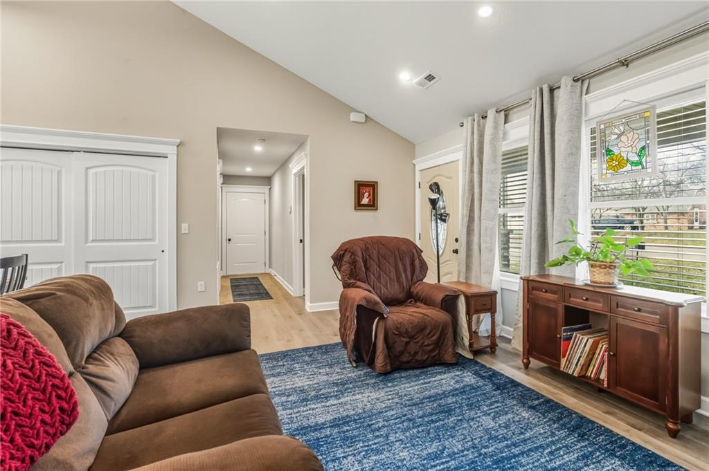 Easy Living, Elevated Style~ Welcome Home! Say hello to modern comfort made easy in this beautifully designed, newer-construction 2 bed, 2 bath, ranch home where style meets accessibility. Thoughtfully built for effortless living, this home invites you in with no-step entry, wide open spaces, and a layout that simply works for today’s lifestyle. Inside, natural light fills the open-concept living area, highlighting vaulted ceilings, a cozy travertine stone fireplace, and high-end finishes throughout. The stunning kitchen is a showstopper, featuring Amish-made custom cabinetry, a travertine backsplash, Quartz countertops, stainless steel appliances with an induction cooktop, and a large island perfect for gathering, entertaining, or everyday meals. The primary suite offers a spacious ensuite and walk-in closet, while the second bedroom is ideal for guests, a home office, or hobbies. Every detail was designed with comfort and convenience in mind, from custom cabinetry throughout to energy-efficient systems and added gutter guards. Step outside and enjoy a private patio, a fully fenced backyard perfect for furry friends, and a side yard with room to garden or unwind, on a nice corner lot. The attached 2-car garage offers room for storage, and yes, washer and dryer stay! Accessible, low-maintenance, and absolutely inviting, this home is ready for you to move in, relax, and fall in love.