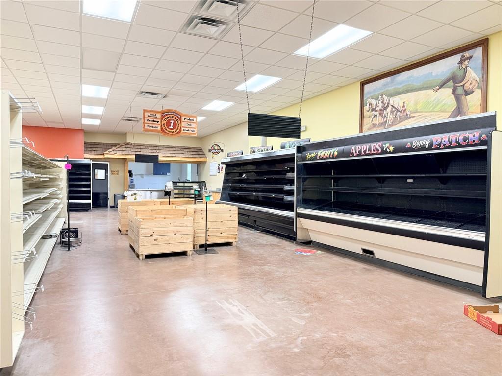 Versatile Commercial Building in the Heart of Jamesport, MO! Exceptional opportunity to own a well-maintained 9,626± square foot commercial building, constructed in 2012, located in the charming and progressive rural community of Jamesport, Missouri. Previously operated as a grocery store, this property offers outstanding infrastructure suitable for a wide range of commercial uses. The building features concrete floor throughout, and durable metal siding accented with an attractive stone façade, creating excellent curb appeal. Inside, the layout includes a spacious retail area, two bathrooms, a dedicated office, breakroom, and a backroom storage area designed for efficient operations. The property is equipped with 3-phase power, a fully functional HVAC system, and existing coolers and freezer units that operate off a central refrigeration system—an ideal setup for food service, retail, or cold storage uses. A new Conklin coating roof installed in May 2025 comes with a transferable warranty, offering long-term peace of mind. Additional highlights include a rear loading dock with overhead door, two double-entry storefront doors, each with covered concrete patio areas, and a 16-camera security system with audio and video monitoring. The site sits on just under one acre, providing ample parking with concrete across the storefront and additional gravel parking. Location is key, surrounded by a community center to one side and downtown retail businesses on the other side, being central for all the local happenings. This well-equipped commercial property combines functionality, visibility, and flexibility in a growing community—an excellent investment or owner-operator opportunity.