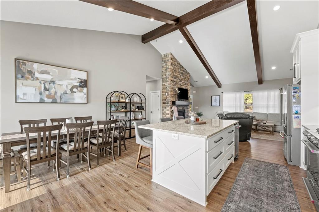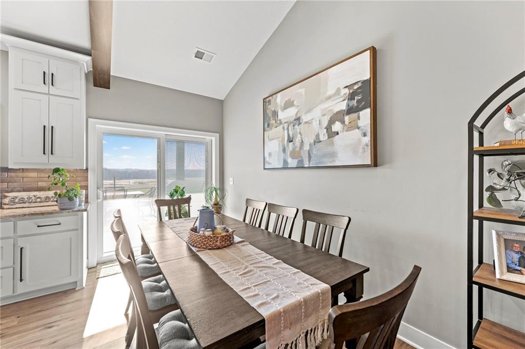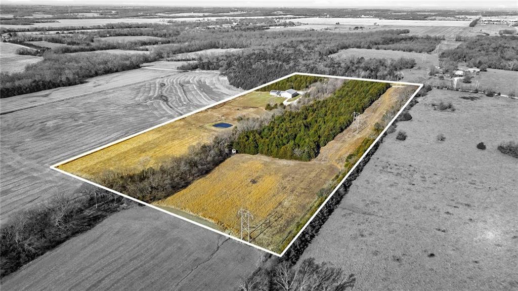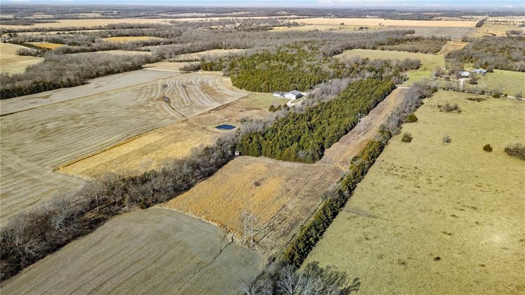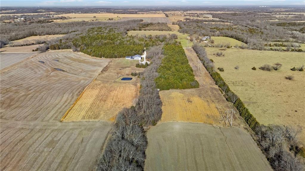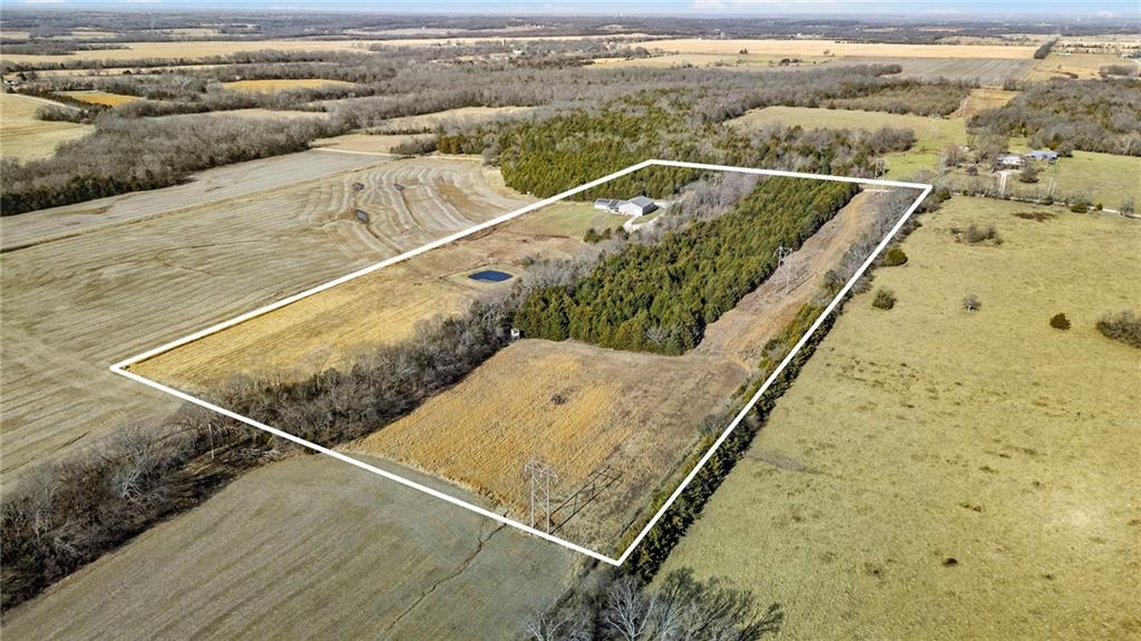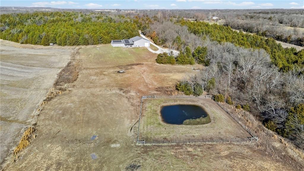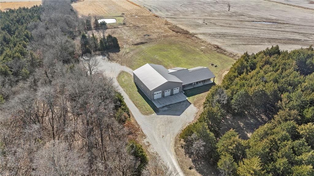 This absolutely stunning, custom-built 2021 barndominium offers the ultimate in secluded luxury across 20+ acres of gorgeous timber and pasture, greeting you with a sprawling covered porch perfect for taking in the abundant local wildlife. The interior showcases the finest craftsmanship through an open-concept layout defined by soaring ceilings, luxury vinyl flooring, and expansive walls of windows that flood the home with natural light. At the heart of the residence sits a gourmet kitchen featuring granite countertops, a massive island, custom cabinetry with pull-out drawers, and a 9x8 walk-in pantry with outlets, all flowing seamlessly into a dining area and a great room anchored by a cozy rock gas fireplace. Practicality meets style in the spacious mudroom, flanked by a dedicated laundry area and a convenient half bath, while the private primary suite serves as a true retreat with its tiled shower, deep soaker tub, and walk-in closet. Two additional generous bedrooms and a full bath provide ample space for family or guests, while a fully concrete 10 x 10 safe room ensures peace of mind. The home's technical specifications are equally impressive, featuring a sophisticated solar energy system supported by a propane gas generator and battery storage for total self-sufficiency. Covered back patio, great for entertaining. Completing this exceptional property is a 50x64, fully insulated, and sheet rocked garage/shop equipped with 200 AMP service, three overhead doors, an exit door, and dedicated attic storage—all situated on a prime piece of land ideal for hunting, farming, or recreation.