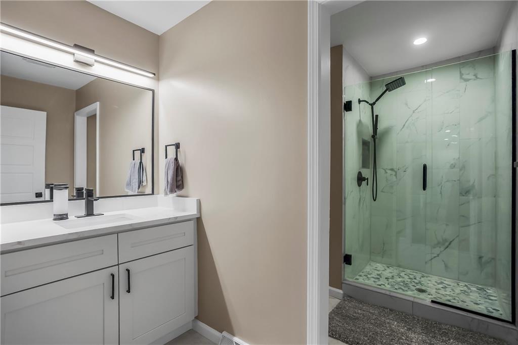 Prime Overland Park for this beautifully remodeled ranch home in the award-winning Shawnee Mission East School District. This home offers almost 3,000 sq. ft. of main level living space, and every detail has been thoughtfully renovated. As you step inside, you're greeted by a spacious open-concept living/dining room featuring refinished hardwood floors, black ceiling beams, & dual sliding doors that open to a large concrete patio – perfect for indoor-outdoor entertaining. The remodeled kitchen boasts: A large center island, stainless steel appliances, including an induction range with air fryer, Soft-close hardwood cabinetry, Stunning quartz countertops, A see-through fireplace connecting the kitchen and dining area. This true ranch offers 4 generously sized bedrooms including primary all on main level, each with its own fully remodeled en-suite full bathroom featuring: Modern vanities, ceramic tile flooring & showers, Updated toilets & plumbing fixtures, Stylish light fixtures & black hardware. Additional main-level features include: A main level family/rec room (Could convert to 5th bedroom), main-level laundry, New solid core interior doors throughout, new carpet, new interior paint, unfinished walkout basement offers incredible potential for a future bedroom, home gym, or additional living space complete with a fireplace. Exterior highlights include: Oversized 2-car garage, Circular front driveway + 2 additional double car driveways, New HVAC system w/ 10 year warranty, New water softener & water conditioner system, Water Heater ( 3 years old), New 6-inch seamless gutters, newer plumbing lines (sewer & water), New windows in bedrooms & kitchen, Spacious patio w/ access from primary bedroom, living room, & kitchen, This home could also be great multi-generational family, plus near shopping, restaurants, freeways & lots of entertainment.
