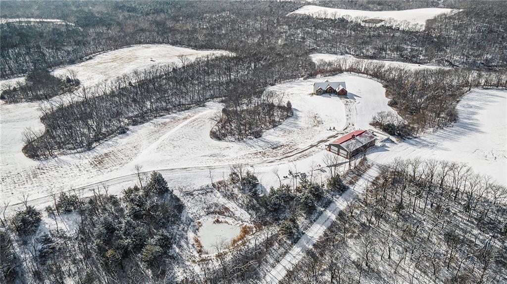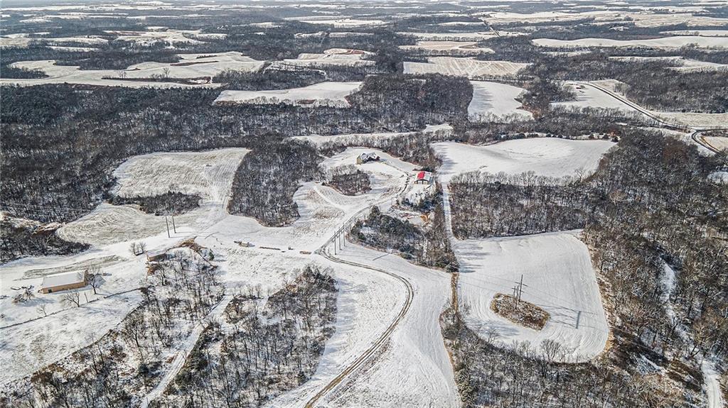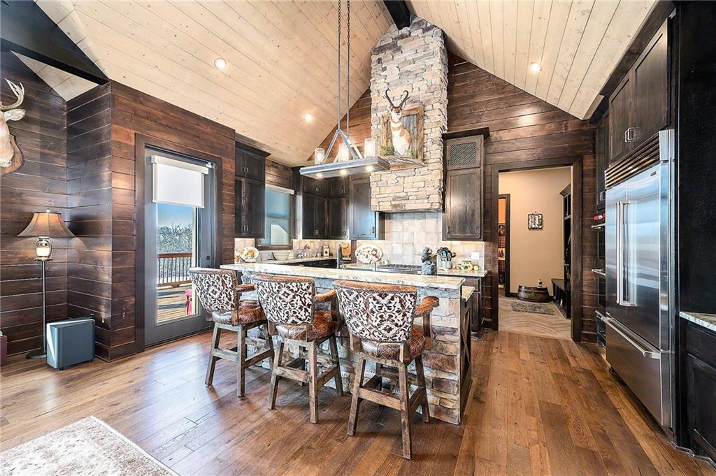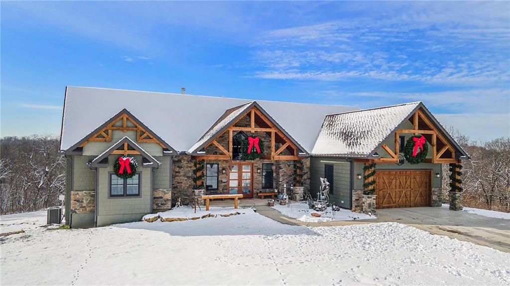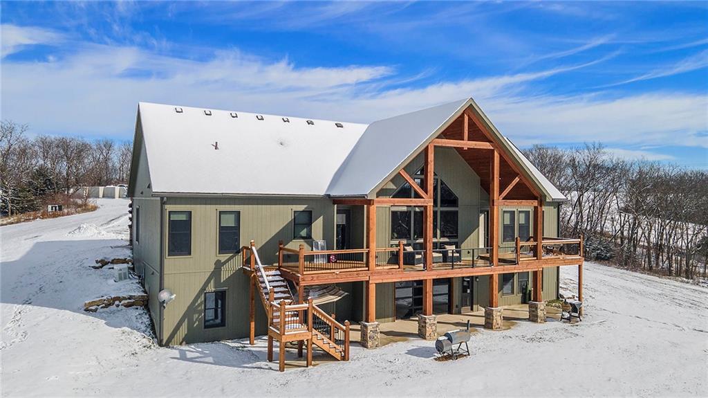 Exceptional custom-built, lodge-inspired home situated on approximately 60± scenic acres, offering privacy, panoramic views, and quality craftsmanship throughout. The home features a striking great room with vaulted ceilings, exposed timber beams, tongue-and-groove pine walls and ceilings, and a floor-to-ceiling stone fireplace with custom built-ins. The kitchen is thoughtfully designed with high-end stainless steel appliances, custom cabinetry, and generous workspace. The primary suite offers a private retreat with a spa-like bath featuring a copper claw-foot soaking tub. Warm wood tones, stone accents, and expansive windows create a seamless connection to the surrounding landscape. Outdoor living includes a covered deck and patio overlooking rolling terrain and timber. The property includes two outbuildings and a mix of open ground and wooded acreage, ideal for hunting, recreation, and nature enjoyment.