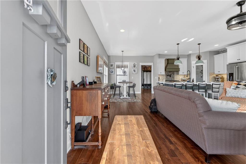 Step inside this thoughtfully upgraded home, where open spaces and abundant natural light highlights designer finishes throughout, creating an atmosphere that feels warm, refined, and intentionally crafted. Plush bedrooms, luxury carpet and padding, and pre-finished hand-scraped Acadia flooring provide a perfect balance of comfort and durability, while upgraded wainscoting, feature walls, plantation shutters, and soft-close cabinetry elevate each space with timeless style. The heart of the home is anchored by a gas fireplace with custom mantel and a well-appointed kitchen featuring a gas range, upgraded plumbing fixtures, and refined details designed for both function and beauty. Atrium doors lead seamlessly to the extended patio, offering serene views and effortless indoor-outdoor living — ideal for morning coffee, evening relaxation, or hosting friends and family. The primary suite is a private retreat, showcasing a full tile shower with tiled pan and walls, a freestanding soaking tub, upgraded sinks and fixtures, and a spa-like ambiance designed to unwind and recharge. The expansive three-car garage is fully equipped with built-in shelving, a workbench, dust collection system, mini-split heating, future EV charger plug, and a third-car garage opener with camera — perfect for hobbyists, storage, or modern convenience. Additional enhancements include a water softener, radon mitigation system, whole-home humidifier, laundry room washer basin with drain, exterior JellyFish lighting, and thoughtful technology touches throughout. Beyond the home itself, enjoy the vibrant lifestyle of New Town at Harmony, a community rooted in new urbanism with walkable streets, scenic canals, parks, and gathering spaces woven into daily life. Amenities include concert venue space, playgrounds, sand volleyball courts, a community pool, neighborhood coffeeshop and fitness center — creating a neighborhood where connection, activity, and convenience thrive.
