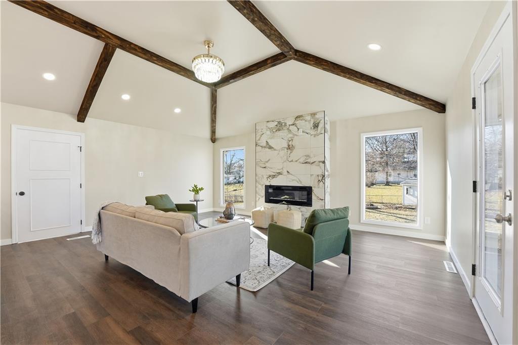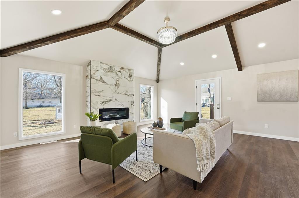 Welcome to this fully renovated split-level home, completely transformed from top to bottom and tucked into a quiet, established neighborhood with mature trees. The main level is bright and open with vaulted ceilings, exposed wood beams, and a comfortable living space that flows into the dining area and updated kitchen featuring ALL brand-new stainless steel appliances, white cabinetry, and modern finishes. Just off the main living area, a large sunroom offers additional space to relax or entertain. Upstairs, you’ll find well-sized bedrooms, including a primary suite with its own bathroom, plus an updated hall bath. The laundry is conveniently located on this level, right next to the bedrooms, making everyday living easy. The finished lower level adds valuable flexibility with a second living space, a full bathroom, and a spacious non-conforming 4th bedroom with a walk-in closet. With private exterior access, this area works well for guests, a home office, or additional living space. Additional features include updated flooring throughout, modern fixtures, ample storage, a two-car garage, and a rear deck overlooking the yard. Located just minutes from North Kansas City Hospital and approximately 10 minutes from Downtown Kansas City, this home offers quick access to city amenities while still feeling removed from the busy city life. Move-in ready and thoughtfully renovated throughout, this home is truly unrecognizable from its original condition and offers a functional layout, great location, and flexibility to fit a variety of lifestyles.