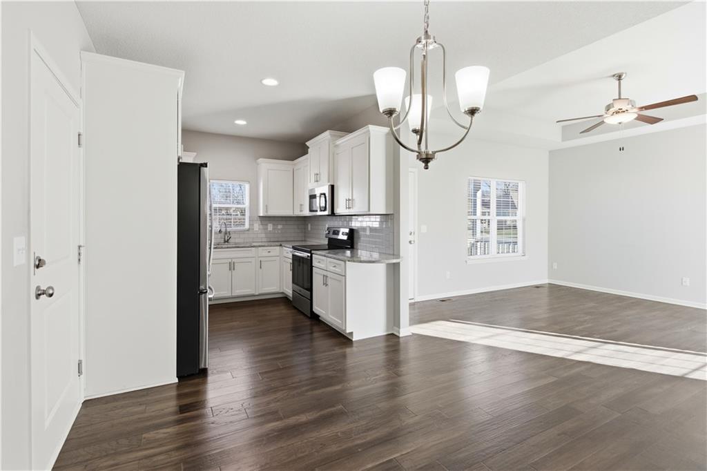 Welcome to maintenance-free living in this 55+ community home, ideally located just one mile from The Legends and Village West shopping district—soon to be the hub for all Kansas City sports! Open floor plan w/ beautiful hardwood floors throughout the main living areas. The spacious great room boasts a large vaulted ceiling, creating an airy and inviting atmosphere. The kitchen offers plenty of cabinet space, granite countertops, a pantry, and a full stainless steel appliance package. The primary bedroom is generously sized with its own vaulted ceiling, a walk-in closet, secondary closet and a private bath complete with a large shower. Both bathrooms feature ceramic tile floors for easy maintenance. Enjoy relaxing evenings on the nice back patio or the front charming country porch. The large two-car garage provides plenty of parking and storage space. This energy-efficient, all-electric home is equipped with heat pumps for year-round comfort. Plus, a HUGE unfinished full basement offers endless possibilities for additional living space or storage.
