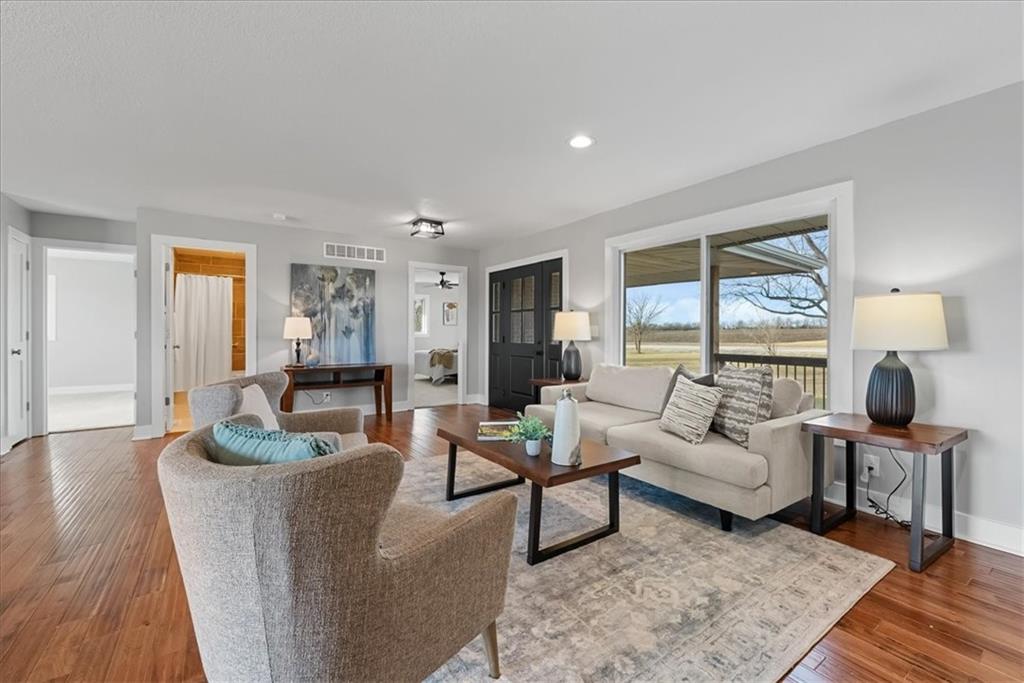 Acreage & ranch-style living! Fully renovated 3,017 sq ft ranch on 10 acres with 4 beds, 3.5 baths, finished walkout basement, and flexible main-level office/4th bedroom. Modern updates blend with classic ranch design—perfect for buyers seeking space, privacy, and country living with style. At the heart of the home is an all-new kitchen featuring abundant cabinetry, quartz countertop surfaces, and brand-new appliances—designed for both everyday living and entertaining. New bathrooms, all new windows, doors, flooring, HVAC System, Electrical Box and wiring, Siding, Exterior and Interior paint and all-new fixtures throughout reflect the home’s comprehensive renovation and elevated finish. Everyday functionality shines with an expansive mudroom and main-level laundry, along with a walk-in pantry complete with a convenient grocery door to the garage. The finished walkout basement extends the home’s versatility, offering a wet bar, professional epoxy flooring, and a striking glass-and-tile walk-in shower—ideal for hosting, relaxation, or extended living. The 2.5-car side-entry garage has new epoxy floors, providing durability with a polished look. Outdoor living is enhanced by a large new deck and expansive concrete patio overlooking the peaceful, open acreage. Additional amenities include a 40x60 outbuilding with electricity and a convenient lean-to, perfect for equipment, animals or additional storage. Paved road access—no gravel. The buyer receives first right to purchase the adjoining 8 acres, offering potential for added privacy or future expansion. NO HOA. No fencing. Just space, freedom, and the opportunity to make it your own.