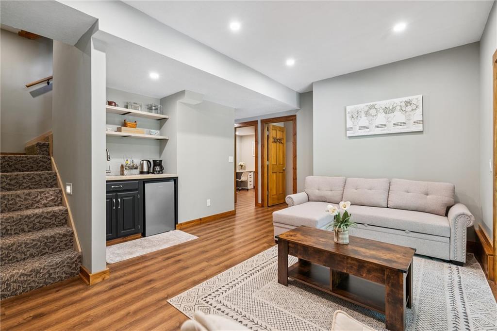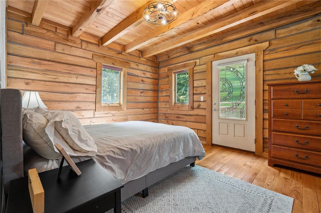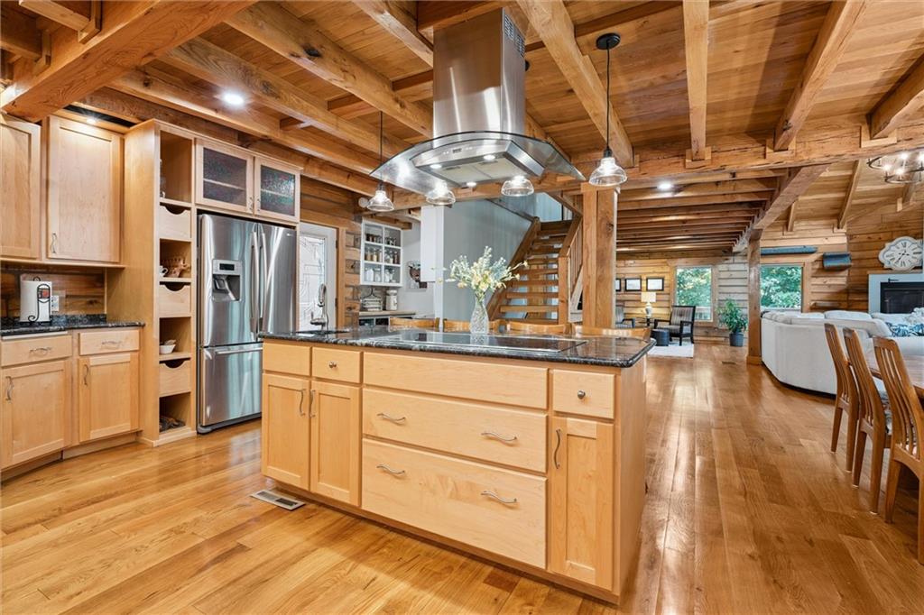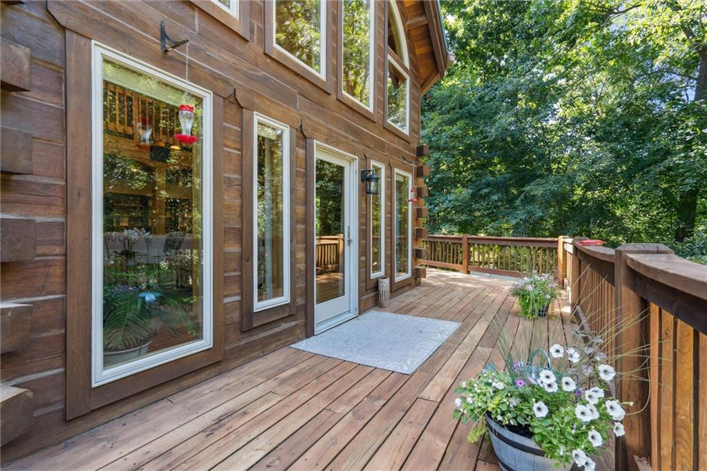 Stunning Log Home on 5 Wooded Acres! So much privacy and situated on all paved roads just 20 Minutes from Lee’s Summit! This custom log home offers over 3,500 sq ft of finished living space across three levels. It is nestled on 5 acres in an established rural neighborhood with paved roads as well. Upgrades: Whole House Generac and gas fireplace powered by propane and immediate backup power! Upgraded custom lighting inside and out and sellers finished the walkout basement which includes a second laundry and new hot water heater. Step inside to soaring vaulted ceilings, expansive windows that flood the home with natural light and rich hardwood floors throughout. Main level features a dramatic two-story Great Room with cozy gas fireplace, spacious dining area, and a chef’s dream kitchen complete with custom cabinets and a finished walk-in pantry. A main-level bedroom includes a built-in dresser/vanity with full bath across the hall. Upstairs, the open loft is a great hangout/office and overlooks the great room with lots of natural light. The upper loft also leads to the luxurious primary suite, offering custom built-ins, a private deck, a walk-in closet with laundry hookups, and a spa-inspired ensuite bath. An additional upstairs bedroom with a separate deck completes the upper level. The finished walk-out lower level adds over 600 sq ft of versatile living space, including a family room with direct patio access, a coffee/wet bar, a fourth bedroom, an office, full bath, second laundry area, ample storage, and 1 car garage. Enjoy the outdoors and privacy from multiple decks and porches surrounding the home! The second driveway offers space for additional parking or an out-building. Whether you're entertaining, relaxing, or working from home, this property offers the ideal blend of rustic charm, modern convenience, and peaceful seclusion.