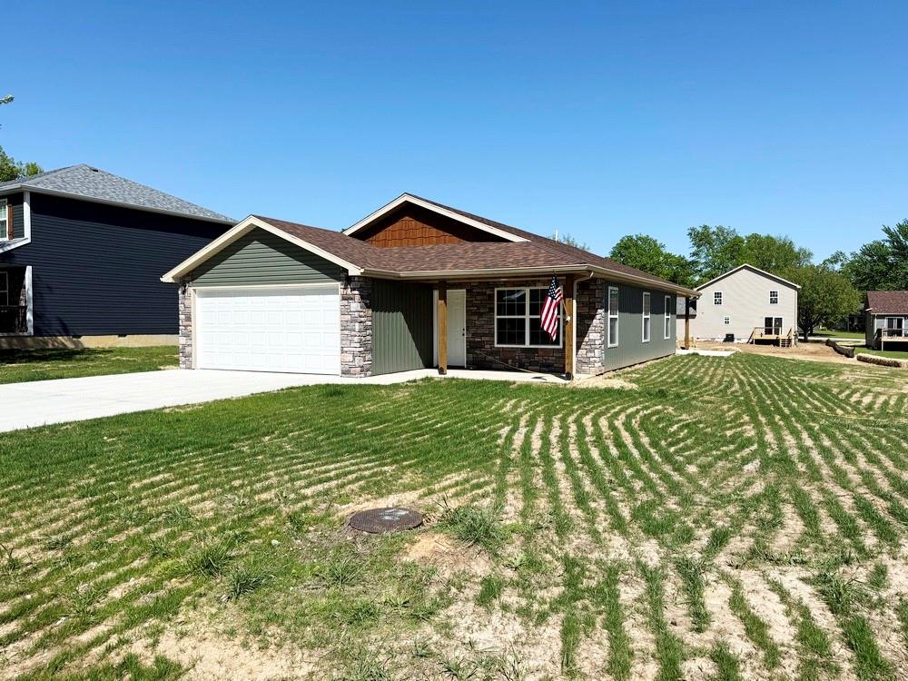 New-Construction Ranch Home in El Dorado Springs: This new-built home, located in a beautiful neighborhood on the south side of El Dorado Springs, will be ready for its first owner in January 2026. The 1,401 sq ft home sits on a level .26-acre lot surrounded by a neighborhood of newer homes. The maintenance free exterior showcases an attractive combination of siding and stone and accented by a front patio and a back BBQ/coffee patio. The main living space is a combination of the living room, dining room, and kitchen that is perfect for entertaining and allows for tons of natural lighting with 2 west-facing windows and 3 south-facing windows. The custom cabinets, with soft-close doors and drawers, granite counter tops, kitchen island, LED lighting, and new black appliances make this a top-tier and attractive kitchen. There are 3 bedrooms and 2 bathrooms with one bathroom ensuite to the master. A 2-car garage is attached. This home has no steps, a 1-year builder’s warranty, low maintenance, and a perfect location for walking, biking, and quick errands to town. Call today and schedule a private showing as the final touches are being finished on 1803 S Elm St in El Dorado Springs.