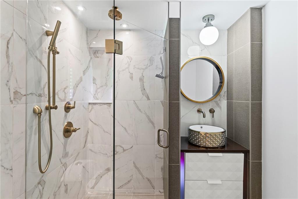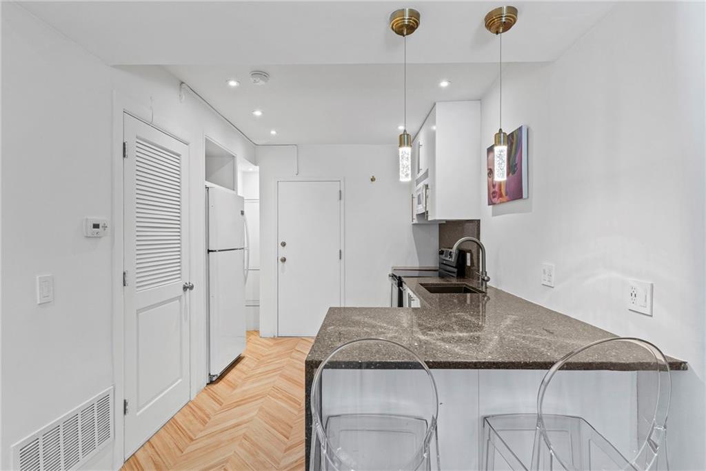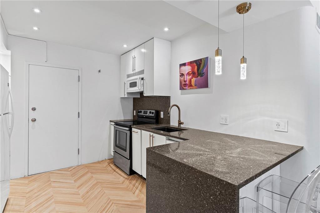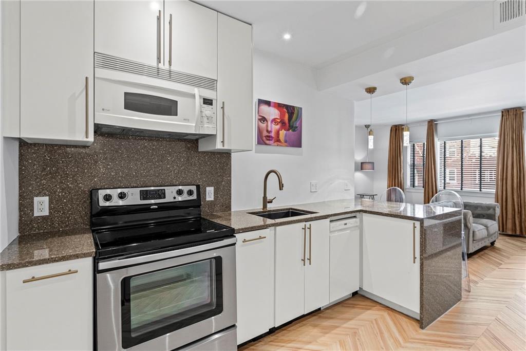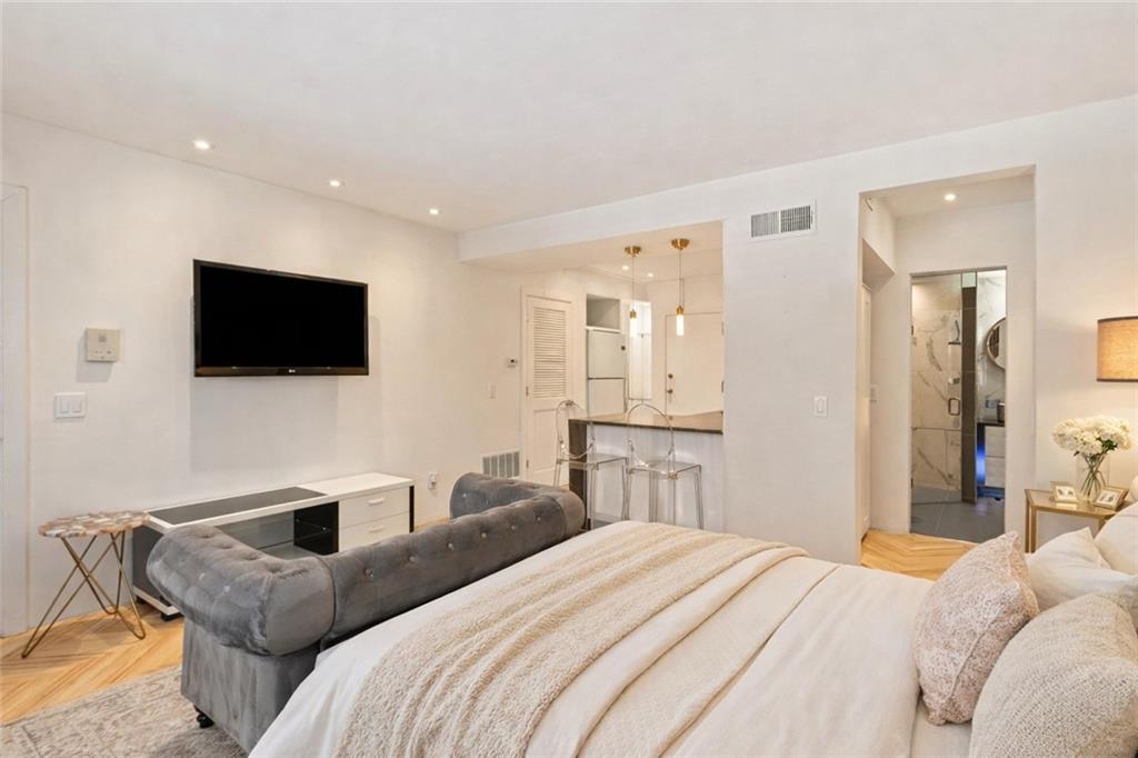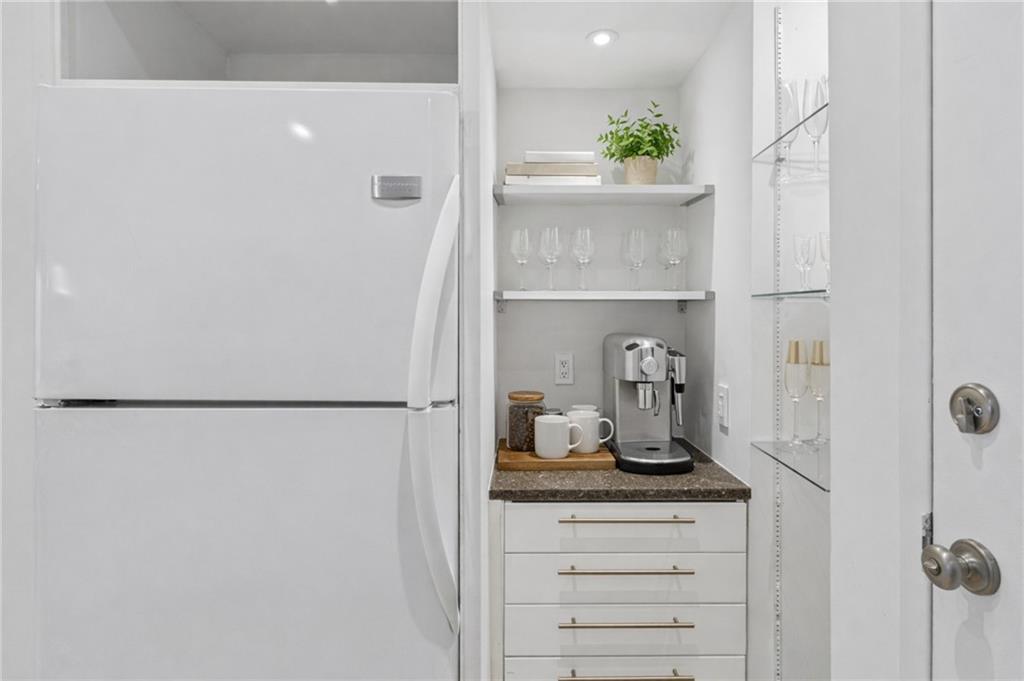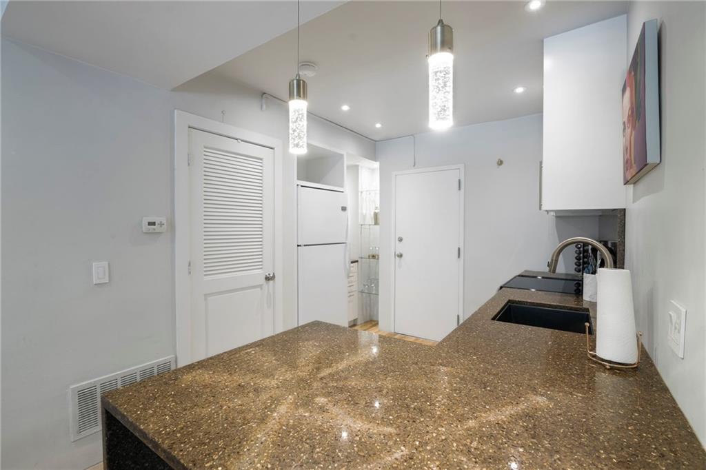 Designer-finished luxury studio just steps from the Country Club Plaza. Features brand-new waterproof, scratch-resistant chevron LVP flooring, a sleek custom kitchen with waterfall Cambria quartz countertops, custom white cabinetry, brass accents, and a dedicated coffee bar with built in shelves. Entire unit has been freshly painted. All the electrical was updated to provide custom illumination, pendant lights and more. All lights on a dimmer. Spa-inspired bath with frameless glass shower and marble-style tile. Full-size in-unit laundry, private storage unit, and exceptional closet space—nearly twice that of the one-bedroom units. Architecturally distinctive art deco building and beautifully maintained grounds. Turnkey Plaza living with an incredibly LOW HOA and previously rented at $1300 a month.