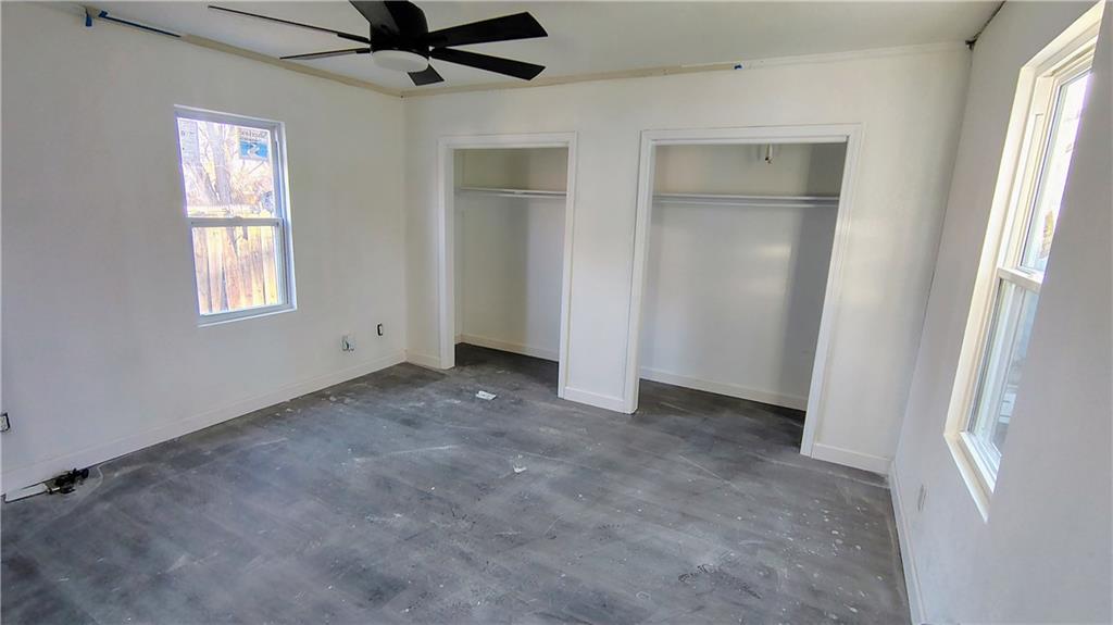 Unfurnished bedroom with two closets, a ceiling fan, and multiple windows