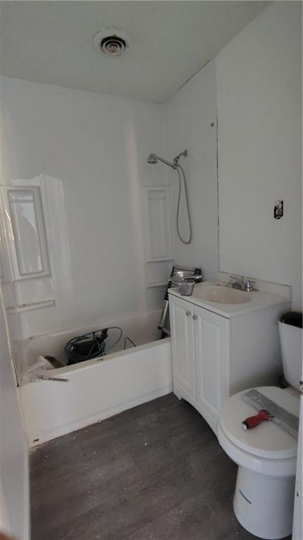 Full bath with vanity, shower / washtub combination, and dark wood-style flooring