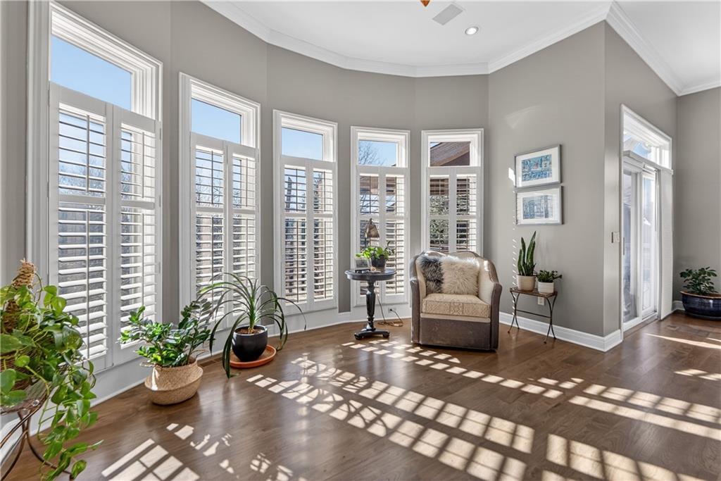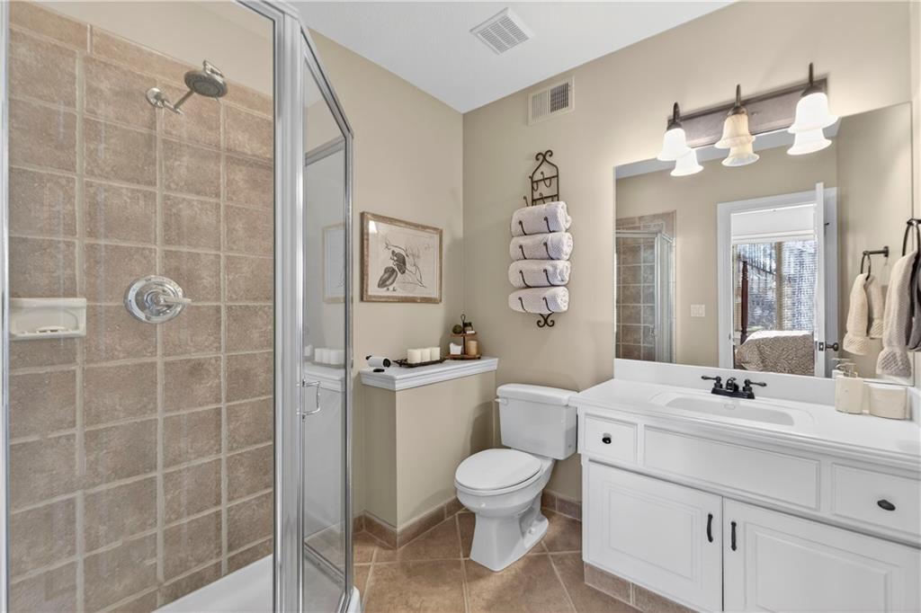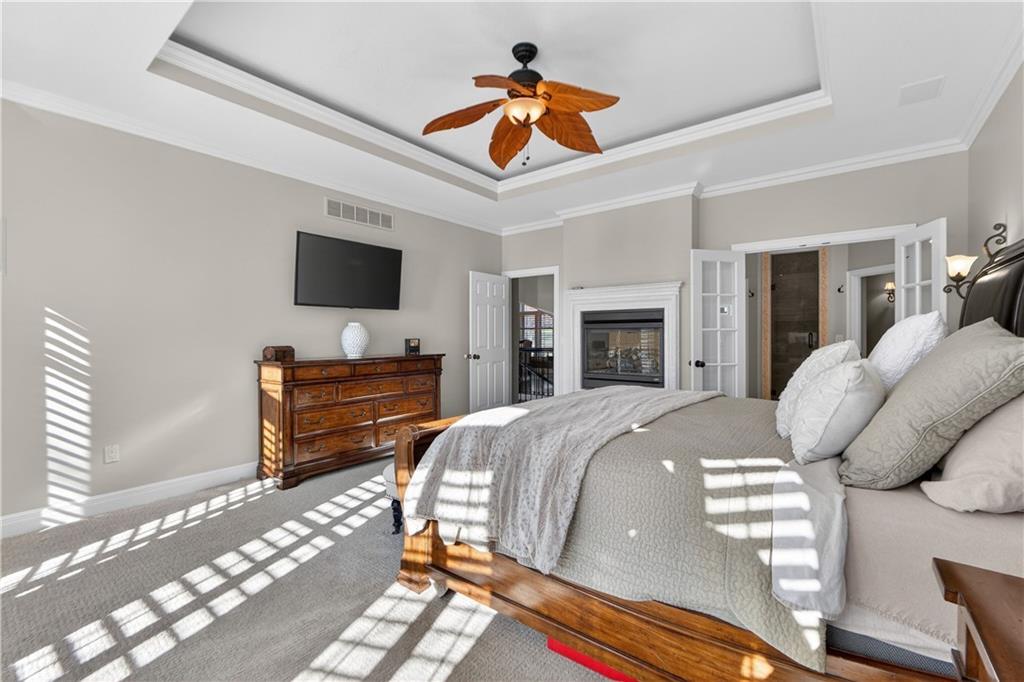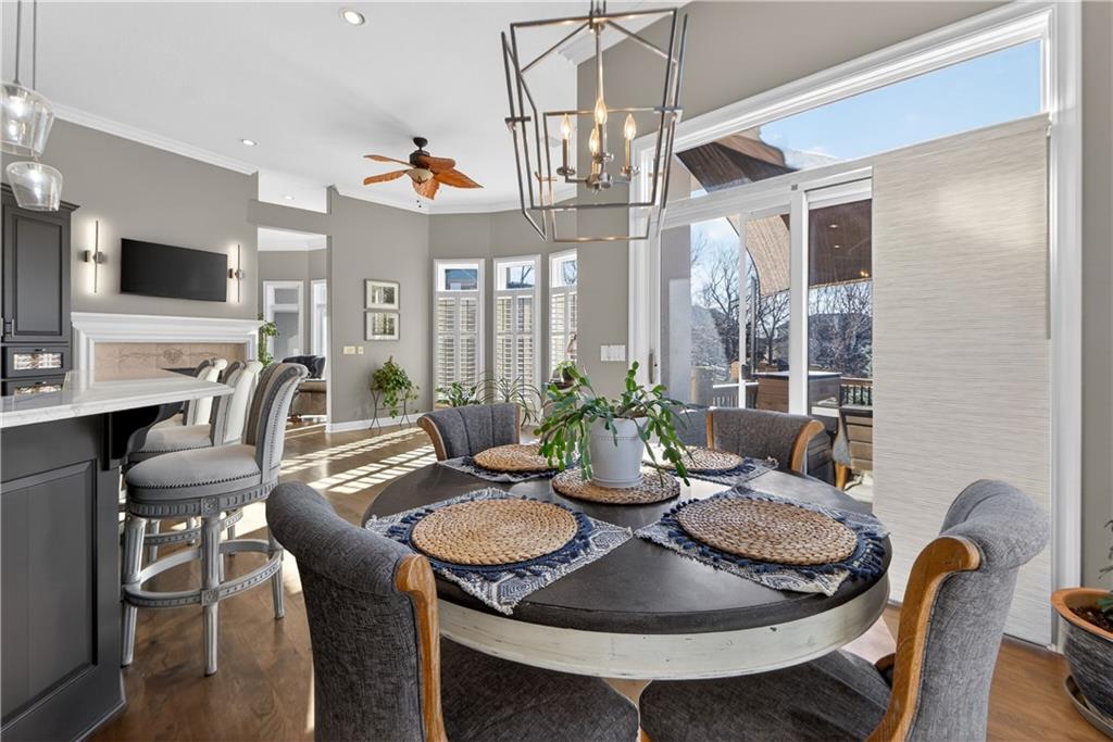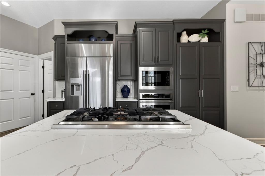 Nestled on a .56-acre treed corner lot in the prestigious Falcon Ridge community, this extensively updated home offers 4,598 sq ft of refined, functional living space. Notable features include a freshly painted exterior, circle drive, arched covered entry with custom door, 4-car garage with radiant heated floors, and a 50-year tile roof. The main level showcases new walnut hardwood floors, fresh interior paint, soaring ceilings, and abundant natural light. Formal living and dining rooms are anchored by a see-through gas fireplace and walls of windows overlooking the private backyard, while the hearth room flows seamlessly into the kitchen. The remodeled kitchen features new custom cabinetry, quartz countertops, a large island, walk in pantry, and high-end Monogram appliances, including a gas range, wall oven/microwave, dishwasher, and Dacor refrigerator. Just off the kitchen, access the brand-new Trex deck, perfectly positioned to enjoy the wooded views and outdoor entertaining. The main-level primary suite offers vaulted ceilings, plantation shutters, a see-through fireplace, and a spa-inspired bath with new cabinetry, quartz countertops, freestanding tub, walk-in shower, and expansive custom closet. Upstairs includes a private office with built-ins and half bath, along with unfinished attic space for storage or future expansion. The walk-out lower level is designed for entertaining with a new rec room featuring built-in projector and surround sound, wet bar with wine and beverage refrigerators, three additional bedrooms, a Jack & Jill bath, a private ensuite, and a non-conforming fourth bedroom ideal for a gym or office. Outdoor living continues to the patio with a gas-plumbed firepit and newly planted trees for added privacy. Additional highlights include zoned heating and cooling, new AC, 75-gallon water heater, and extensive recent updates throughout, making this Falcon Ridge home truly move-in ready.
