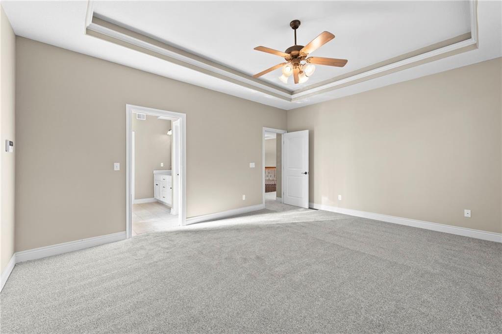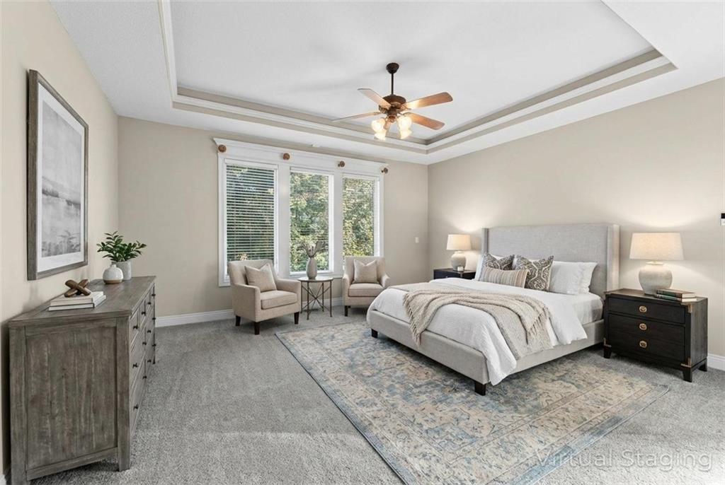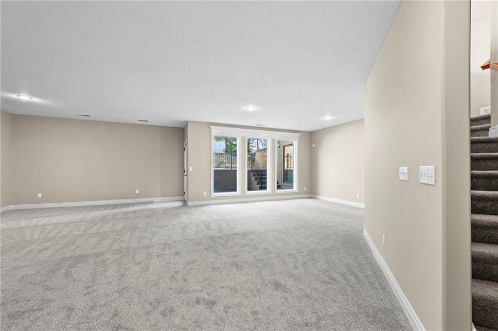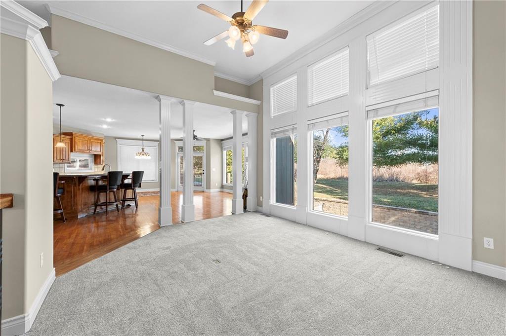 Custom Reverse 1.5 Story home situated perfectly on a private, treed, TRANQUIL lot! Timeless and elegant, this uniquely designed open and spacious floor plan is one-of-a-kind! Soaring ceilings and treed views! Optional 2nd Bedroom, or office on main floor and formal dining off of the entry. Great room that is open to a cozy hearth room w/ gas fireplace, Wetbar, casual dining, hardwood floors, and extended kitchen island with Electric Cooktop, Hardwood floors and HUGE walk-in Pantry! Your own personal Grill Deck from hallway close to kitchen and laundry. Open Deck off of breakfast and hearth room, walk out to your outdoor private OASIS! Stunning, stamped concrete veranda to custom courtyard, waterfall feature, fire pit and mature trees! Perfect for those shaded summer evenings! Spacious Primary Suite and Bath boasting Ceramic Tile Floors, double vanity, whirlpool tub, walk-in shower, and fabulous walk-in closet! Walkout/Walk-up LL with stairs to the concrete Veranda. Open Recreation Room, 2nd Bedroom suite, 3rd full bath, 4th Bedroom and tons of storage! All new carpet throughout! Oversized 3-car garage w/ tall ceilings! Enjoy the perks of living in Tiffany Greens! Golf cart ride to the Community Center & Pool! Set up a round at Tiffany Greens or become a member! Airport is less than 7 minutes away & access to I-29/152/Barry Road/Zona Rosa w/ shopping and restaurants! A true gem awaits! LOVE WHERE YOU LIVE!