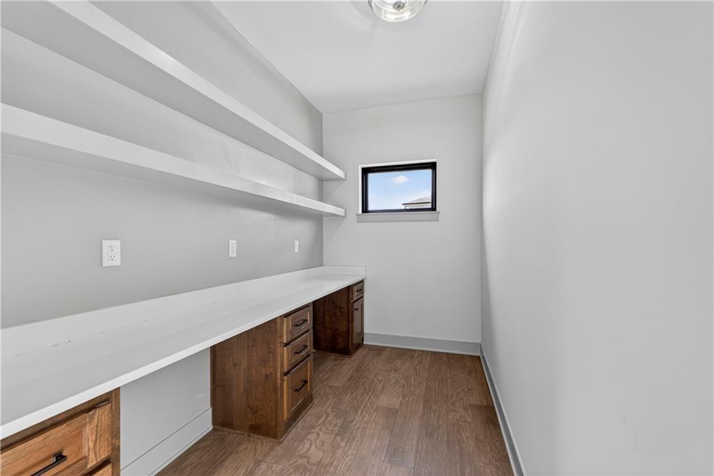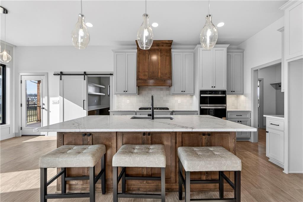 Situated on a premium, private lot backing to serene green space, trails, and a meandering creek, this Reverse 1.5-Story offers the perfect balance of modern luxury and everyday comfort. The thoughtfully designed 4-bedroom, 3-bath layout accommodates both peaceful mornings and effortless entertaining. The main level is anchored by a kitchen featuring sleek quartz countertops, custom cabinetry, a gas cooktop with striking statement hood, and a double-oven configuration with convection microwave. A pocket office is conveniently positioned nearby, while a well-planned mud zone and large pantry seamlessly connects the three-car garage for easy organization and daily functionality. Sunlight fills the great room as it flows into the primary suite, with the laundry thoughtfully located just steps away. A secondary main-level bedroom is privately tucked away—not immediately off the front entry—offering flexibility for guests or a more private home office. The walkout lower level is bright and inviting, designed for gatherings with a spacious recreation room, wet bar, and two generously sized bedrooms. Outdoors, enjoy the tranquility of a peaceful dead-end street with minimal neighbors, an expansive backyard, and an in-ground sprinkler system. Ideally located just minutes from shopping, dining, and entertainment along Adam’s Dairy Parkway, with quick access to I-70 for effortless commuting. Exceptional design, privacy, and convenience come together here—schedule your private tour and experience it for yourself.
