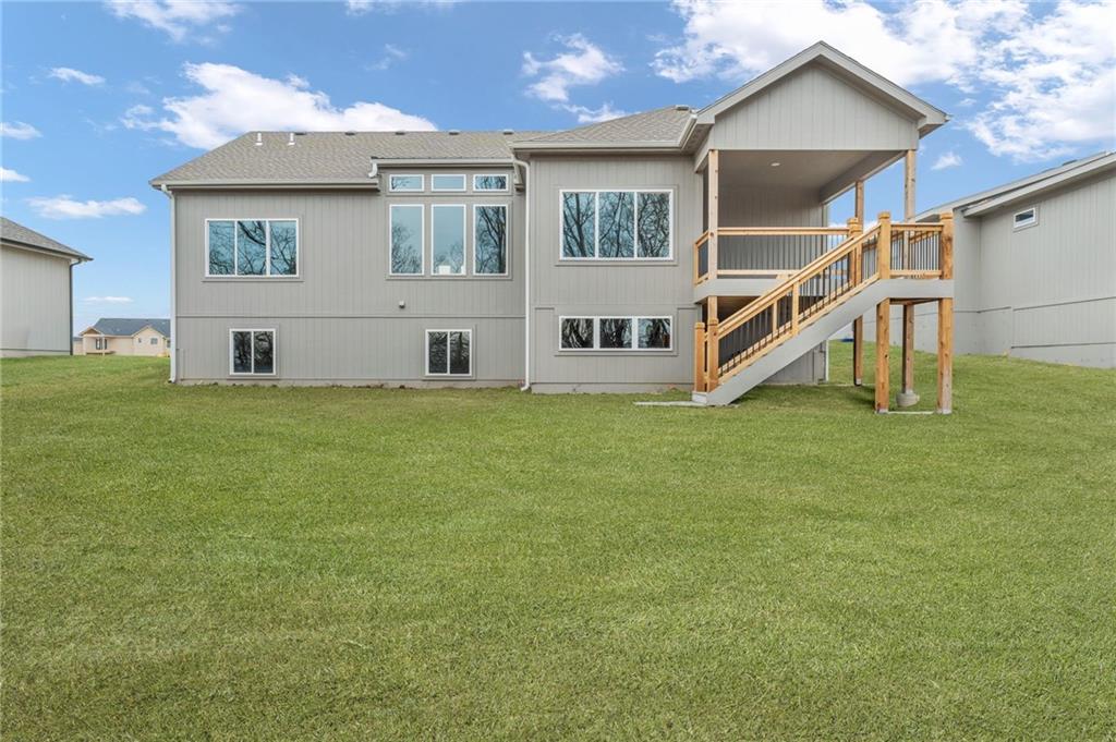 The Bridgeport II Estate floorplan built by Drippé Homes. Open concept daylight basement with tons of natural light! Kitchen furnished with stainless appliances, gas cooktop, hood vent, microwave, wall oven, quartz countertops, large island with oversized sink and spacious walk in pantry. Two bedrooms on main with primary opposite other bedroom. Ensuite features double vanity, tiled walk-in shower, private water closet and gigantic closet with pass through to laundry. Mudroom off garage with boot bench. Finished basement with two additional bedrooms and rec room complete with wet bar, ready for hosting the next big game. Cozy up to the fireplace in the living room or enjoy the sunrise from the covered composite deck. Home backs to tree-line providing ultimate privacy with sod and sprinkler system included. Unfinished basement storage, built-ins and three car garage provide plenty of storage. Almost ready for your personal touch - schedule a showing today!