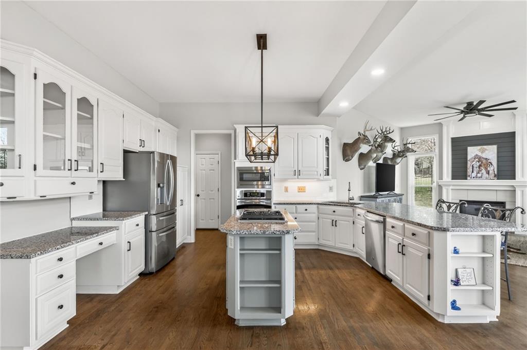 Welcome home to the Fairways, where comfort, space, and convenience all come together. The open kitchen features granite countertops, stainless steel appliances, pantry pull-outs, and updated lighting—perfect for everyday living or entertaining. Cozy up by one of the fireplaces in the hearth room or spacious great room with newer carpet. The oversized primary suite is a true retreat with its own fireplace, huge walk-in closet, soaking tub, and new walk-in shower. Secondary bedrooms are generously sized with walk-in closets and updated baths. Fresh interior paint and recent updates throughout make this home move-in ready. An unfinished basement offers 1,000+ sq ft of future living space and is already stubbed for a bath—ideal for a gym, media room, or extra bedrooms. Enjoy outdoor time on the updated deck with aluminum railing. Located near Hodge Park and Shoal Creek Golf Courses, highways, shopping, and dining. Schedule your showing before it’s gone!