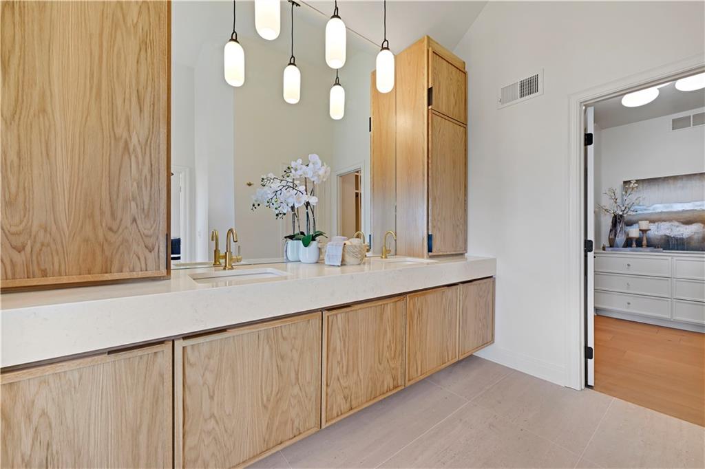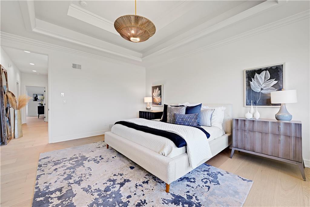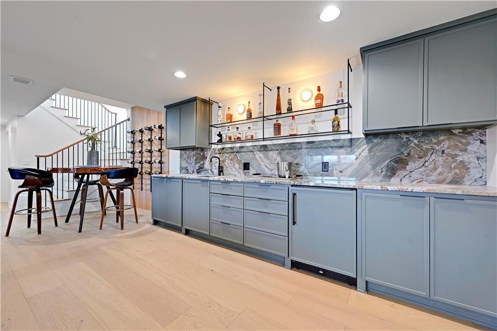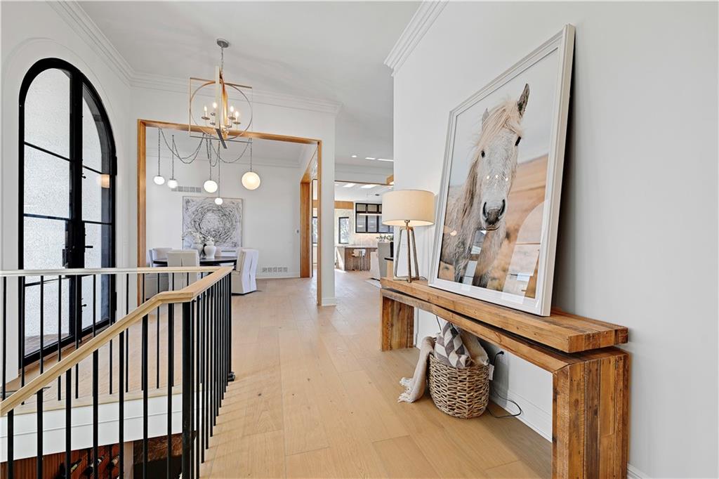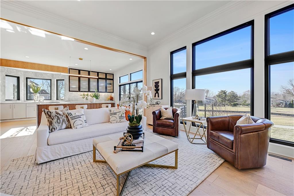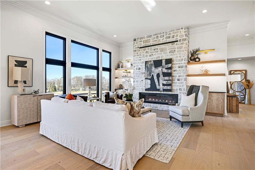 Experience refined luxury in this whole-house designer remodel, where modern elegance meets thoughtful functionality. Striking new black windows and a brand-new roof set the tone, while the half-acre homesite backing to greenspace offers privacy and beauty. Exceptional curb appeal welcomes you with a half-circle drive, brick front porch, and oversized arched glass entry doors, Inside, a wide-open floor plan showcases a showstopping kitchen flowing seamlessly into the living and dining areas. The kitchen is both beautiful and practical, featuring a stunning Taj Mahal quartzite waterfall island, sink-to-ceiling backsplash, six-burner gas range, cabinet-front refrigerator, hidden charging stations, and a pocket-door pantry. A back buffet adds generous storage along with a wine fridge and ice maker—perfect for entertaining. The living room centers around a dramatic floor-to-ceiling fireplace, while the dedicated dining area is highlighted by a statement chandelier. The spacious primary suite is a private retreat, featuring a spa-inspired bath with a wet-room enclosure for the freestanding tub and rain-head shower and heated tile floors. Dual sinks and counter-to-ceiling cabinetry with designer finishes complete the bath. A flexible vaulted ceiling bedroom on the main level with access to a full hall bath offers the perfect option for a guest suite or private office. The finished lower level is designed for both entertaining and unwinding, boasting a large recreation room with built-in entertainment center and a stunning quartzite bar. Two oversized bedrooms and two full baths complete the lower level, providing ample space and comfort. Outdoor living is equally impressive with a stamped concrete patio perfect for relaxing around a fire, and a composite deck, ideal for enjoying the sunset. This stunning, like-new residence is set within the prestigious resort lifestyle community of Loch Lloyd, offering an unparalleled blend of privacy, security, and serene living.