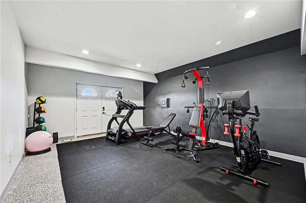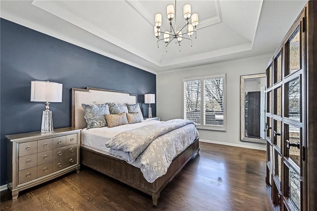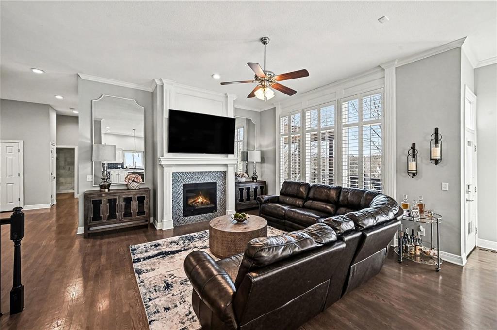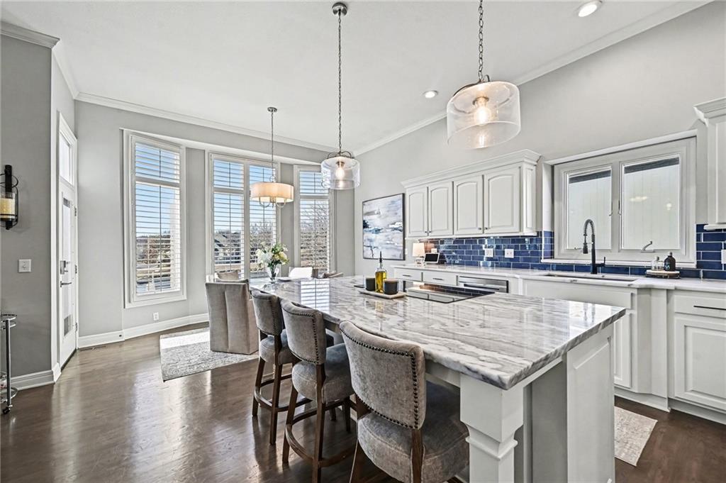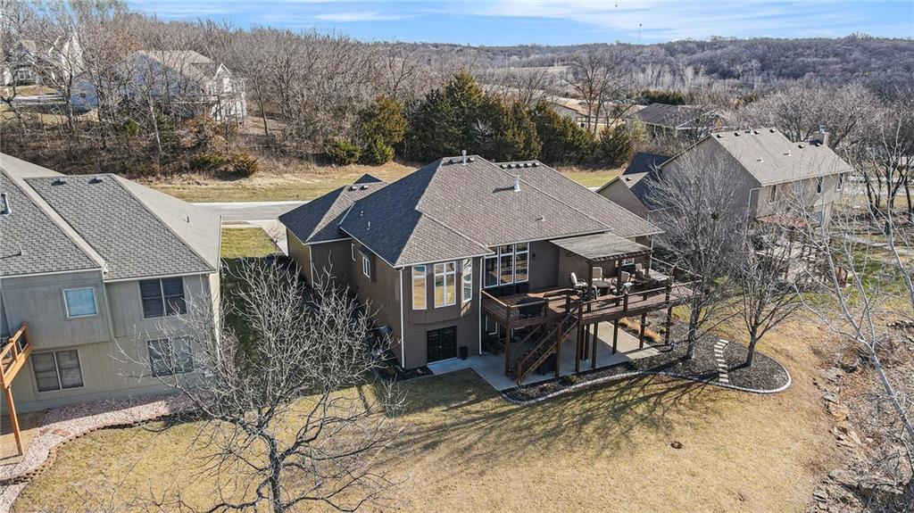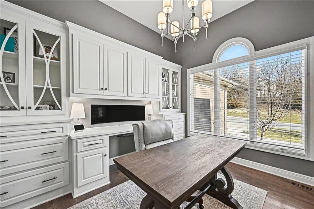 Stunningly remodeled Ranch/Reverse spans over 3,700 sqft. with designer finishes and showcases a bright, open layout highlighted by 11' ceilings and expansive floor-to-ceiling windows with plantation shutters framing a serene neighborhood pond. The main level features the Primary bedroom and a large second bedroom. The Primary suite has a custom closet system with built-in drawers and shelving. The chef's kitchen has a 7' island for dining or entertaining, new cabinets, marble countertops and high-end appliances and a large pantry. Just off the entry you can go through double doors to the home office or formal dining room with custom built-ins. Newly refinished hardwood floors throughout the main level, designer lighting, updated tile fireplaces and fresh interior/exterior paint complete the main living areas. The fully finished lower level includes two additional bedrooms with double closets, a full bath, a spacious family/theater room, two generous storage rooms, and a dedicated room ideal as a home gym, craft space or man cave and includes double exterior doors to the backyard. Outdoors is an entertainer’s dream with a beautifully landscaped yard with concrete decorative edging, sprinkler system, new concrete sidewalk to front entry, large deck with pergola and a covered patio overlooking the stocked pond and views of gorgeous sunsets. The oversized three-car garage features epoxy floors and an extra-deep bay for your truck or SUV. Located in a friendly community within the award-winning Piper school district and just minutes from The Legends Shopping area, close major highways, and only 20 minutes the airport and downtown. This home has been meticulously finished and maintained and has all of the extras you won't find in new construction.