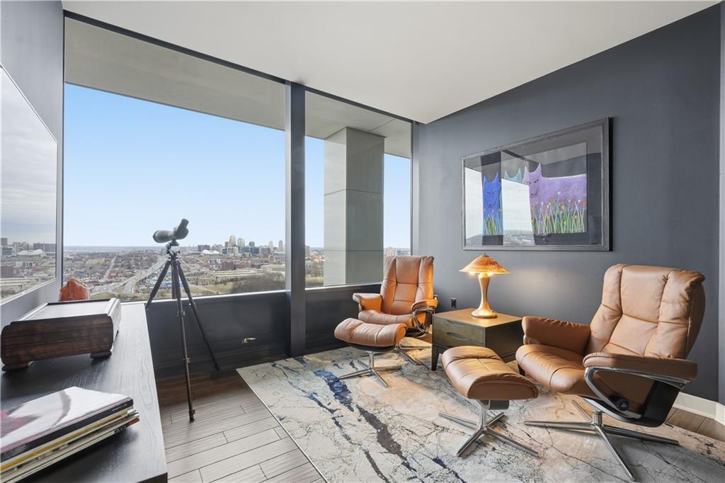 Fully Furnished!!! Breathtaking views from this 15th floor North facing Condominium at One-Park Place! Floor to ceiling windows provide the most incredible views that you will find anywhere in Kansas City. Condo features open floor plan designer finishes throughout, updated lighting and kitchen hardware, hardwood floors, Chef's kitchen with expansive island that is great for entertaining, Two generously sized bedrooms with on-suite bathrooms and walk-in closets, addition half bath, den is perfect for an office/study, media room or play room, remote controlled blackout shades on all windows. Resort style amctenities include 24/7 concierge, indoor an outdoor salt water pools and hot tubs, Cigar lounge, wine cellar with wine tasting room, golf simulator, fitness center with yoga room, steam rooms, massage therapy suite, event space with full kitchen, game room, billiards table, plaza level outdoor space with putting green, private dog park, outdoor grilling and entertaining spaces. Furnishing include all furniture items, area rugs and televisions.