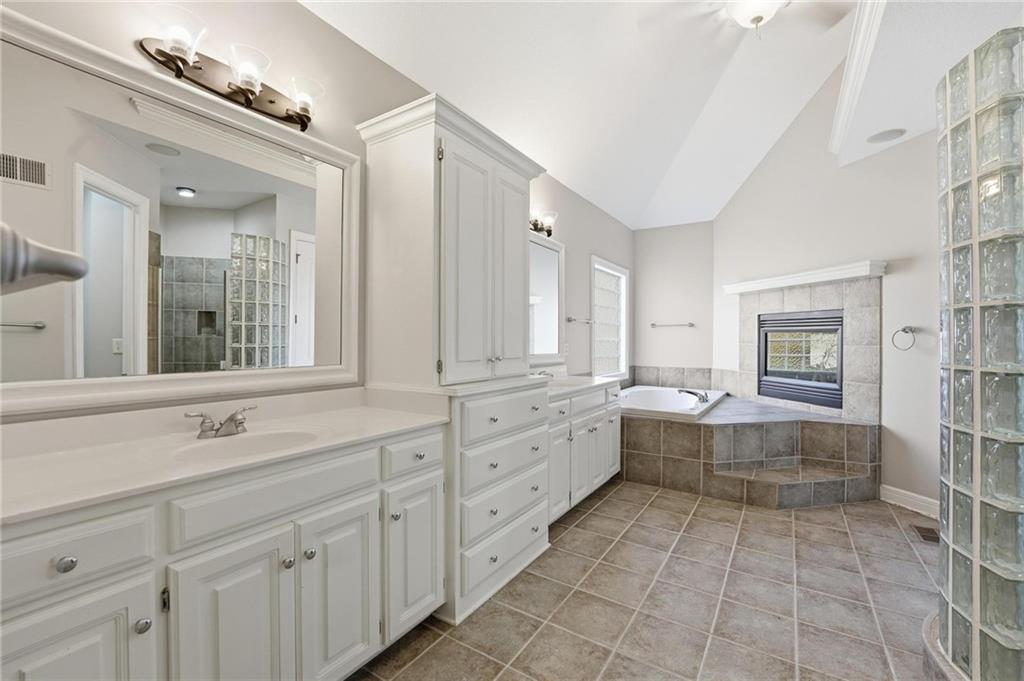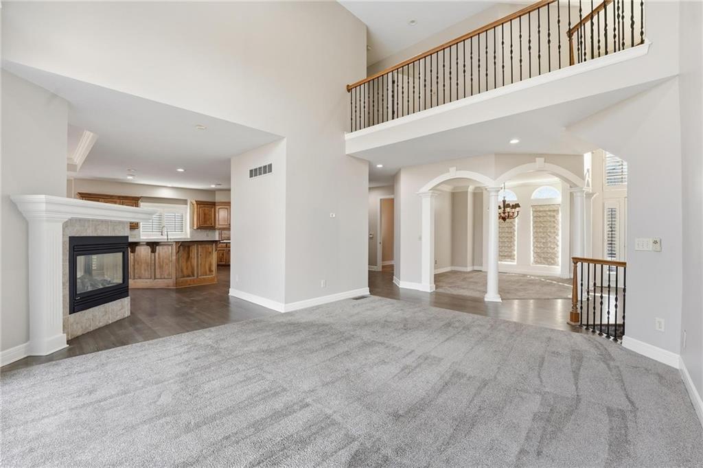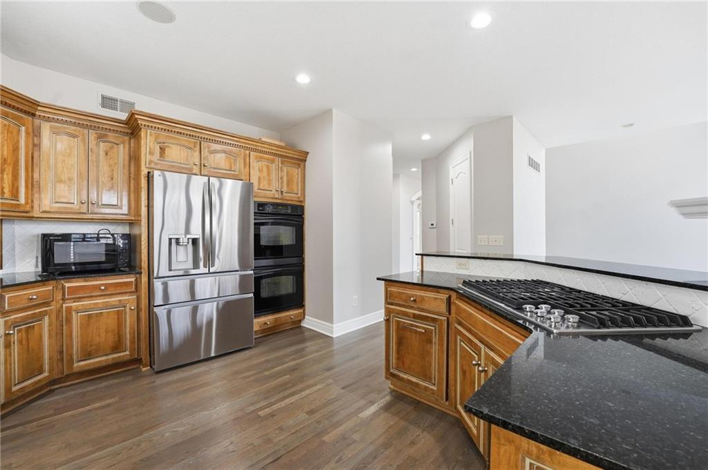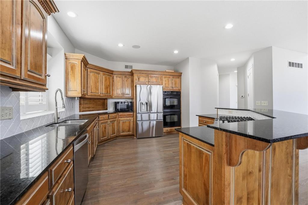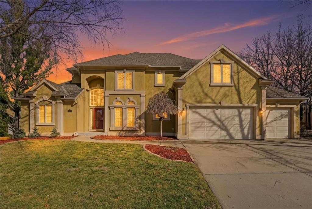 Outstanding 1.5-story home with an exceptional floor plan and upgrades throughout. The dramatic two-story great room features floor-to-ceiling windows, a stunning fireplace, abundant natural light, and plantation shutters. A large formal dining room is perfect for entertaining. The gorgeous kitchen and hearth room combination offers granite countertops, JennAir appliances, beautiful wood floors, a large gas cooktop, and double ovens, ideal for cooking and hosting. The breakfast area just off the kitchen opens to a deck, creating a seamless indoor-outdoor flow. The cozy hearth room features a three-sided fireplace and built-in entertainment center. The main-floor primary suite is a true retreat with a floor-to-ceiling bay window and a luxurious spa-like bath featuring a see-through fireplace. The finished walkout lower level expands the living space with an exercise room, a spacious recreation room, a third fireplace, and a second kitchen, ideal for guests or extended stays. Step outside to a large stone patio that extends across the back of the home, surrounded by beautifully landscaped grounds. The fenced backyard offers privacy and space to relax, play, or entertain. A spacious three-car garage adds convenience and ample storage.