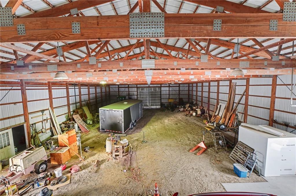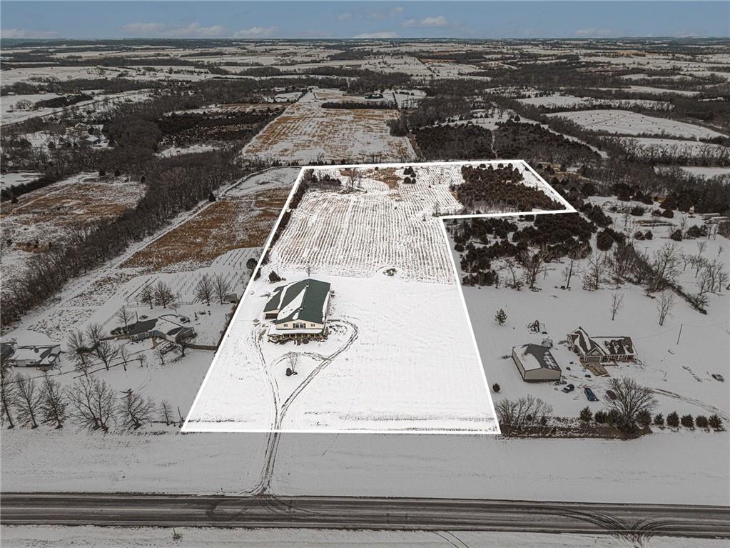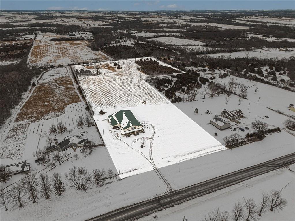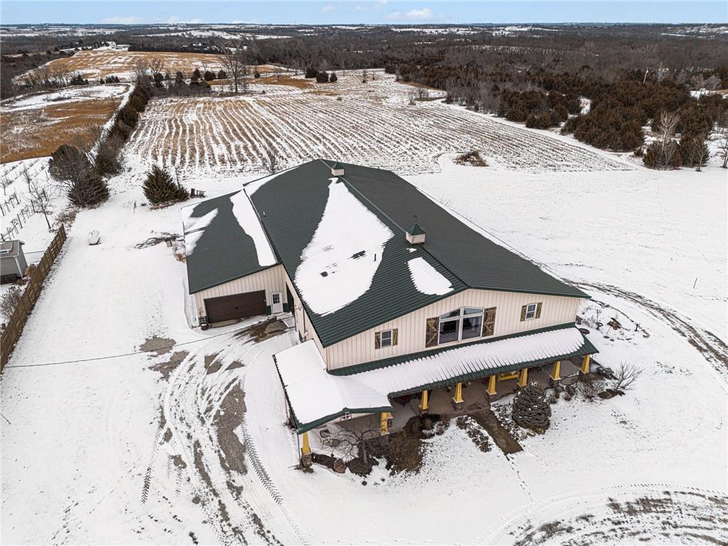 Incredible BARNDOMINIMUM on 15 acres in rural Leavenworth County. Enjoy peaceful country living with convenient highway access in this stunning barn-style home that truly has it all. A large covered front porch welcomes you into approximately 3,500± square feet featuring an expansive open floor plan ideal for comfort and entertaining. Inside, you’ll find custom cabinetry, barn doors, hardwood floors, and tile surfaces throughout. The main-level primary suite was designed for long-term living and includes a zero-entry walk-in shower with heated floors. A built-in tornado shelter adds peace of mind, and abundant storage is available throughout the home. This versatile property also features a 60’ x 90’ horse arena and multiple garage and workshop spaces. In addition to the attached two-car garage, there is a bonus one-car garage/workshop and an additional 24’ x 20’ rear storage area, perfect for equipment, hobbies, or extra vehicles. This is a one-of-a-kind property that offers something for everyone. It’s the one you waited for!!