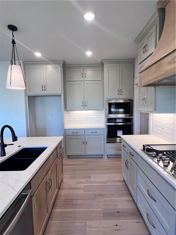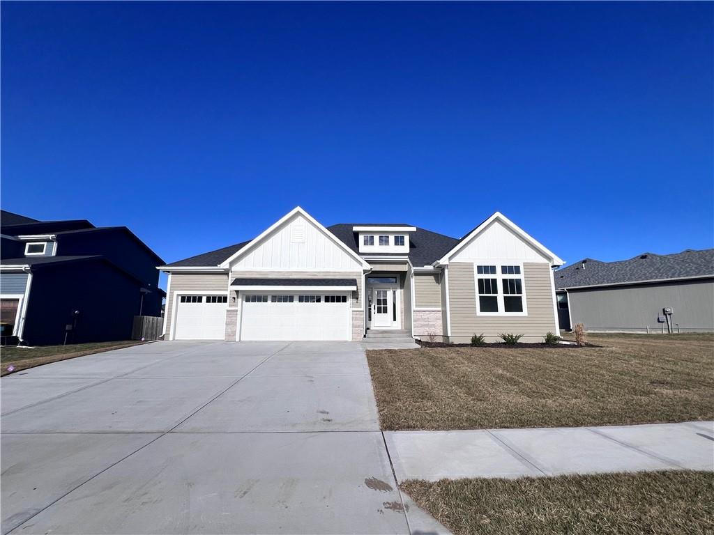 To tour this home, please stop by the model home located at 32290 W 165th Street. Welcome to Symphony Farms, one of the most sought after subdivisions in Gardner. Lifestyle Building & Design's newest plan, The Belmont is a true RANCH HOME with 3 bed, 2 bath, 3 car garage. Everything you need is on the main floor...... Large windows inviting natural light in the open living room, kitchen and dining room. The kitchen has custom cabinets, island and GE Profile appliances including a dishwasher, microwave, cooktop and wall oven and a large custom walk-in pantry! Kitchen opens up to the family room which has a gas fireplace and built-ins, The private entry from the 3 car garage has a custom-made boot bench to keep everything organized. The primary bedroom has vaulted ceiling with a beam, ceiling fan, and he 3 large windows . The primary bathroom has a double vanity and walk in shower with a bench and connects to the custom closet. The 2 secondary bedrooms are next to a shared bathroom. The laundry room has custom cabinets. a fully sodded yard, sprinkler system, insulated garage and garage door openers with key pad. the Belmont has a covered patio and additional patio, fully sod yard, garage door openers with key pad and insulated garage. The large unfinished basement is set up for 2 additional bedrooms, bathroom and family room. Completion date February 2026.