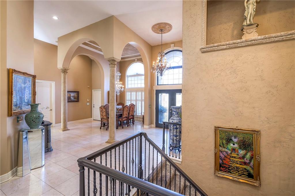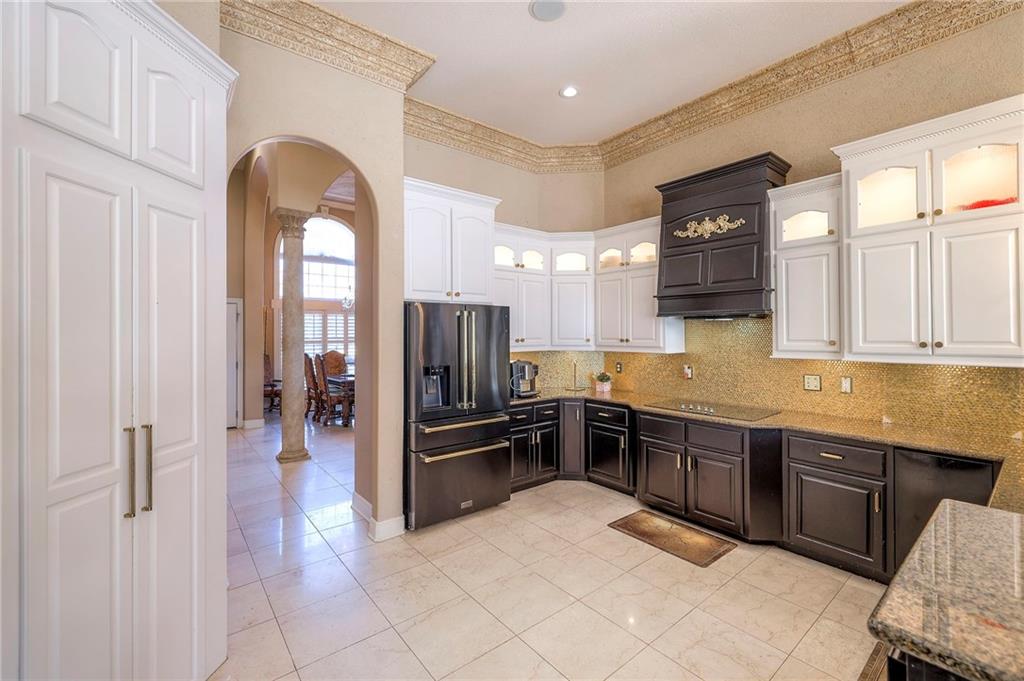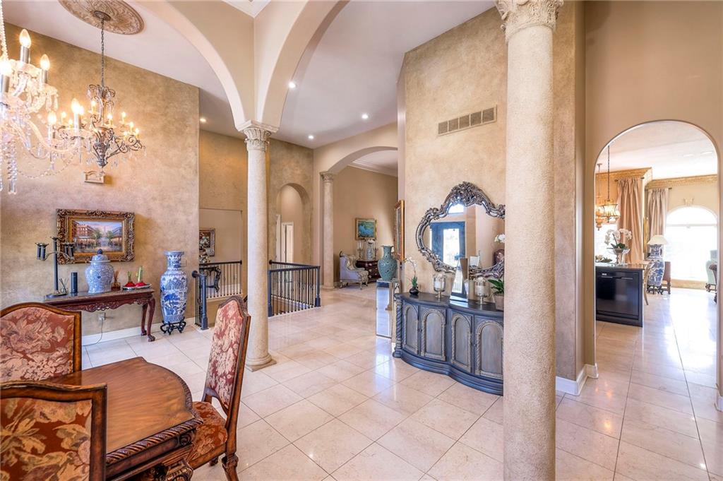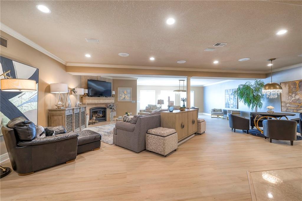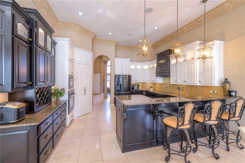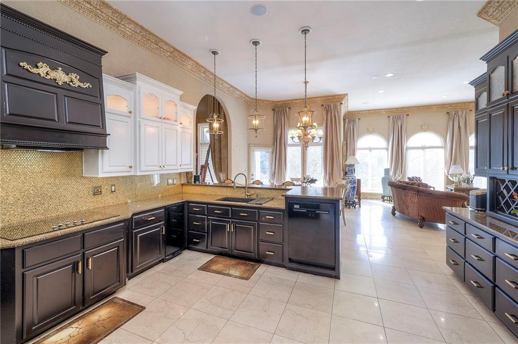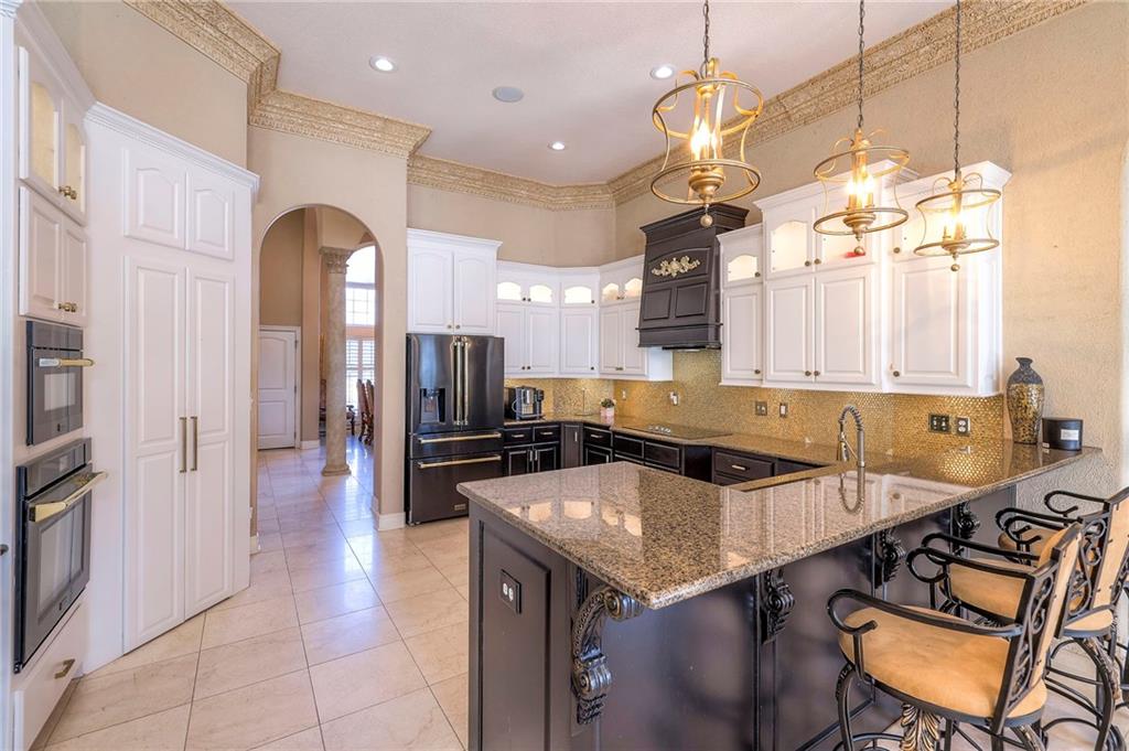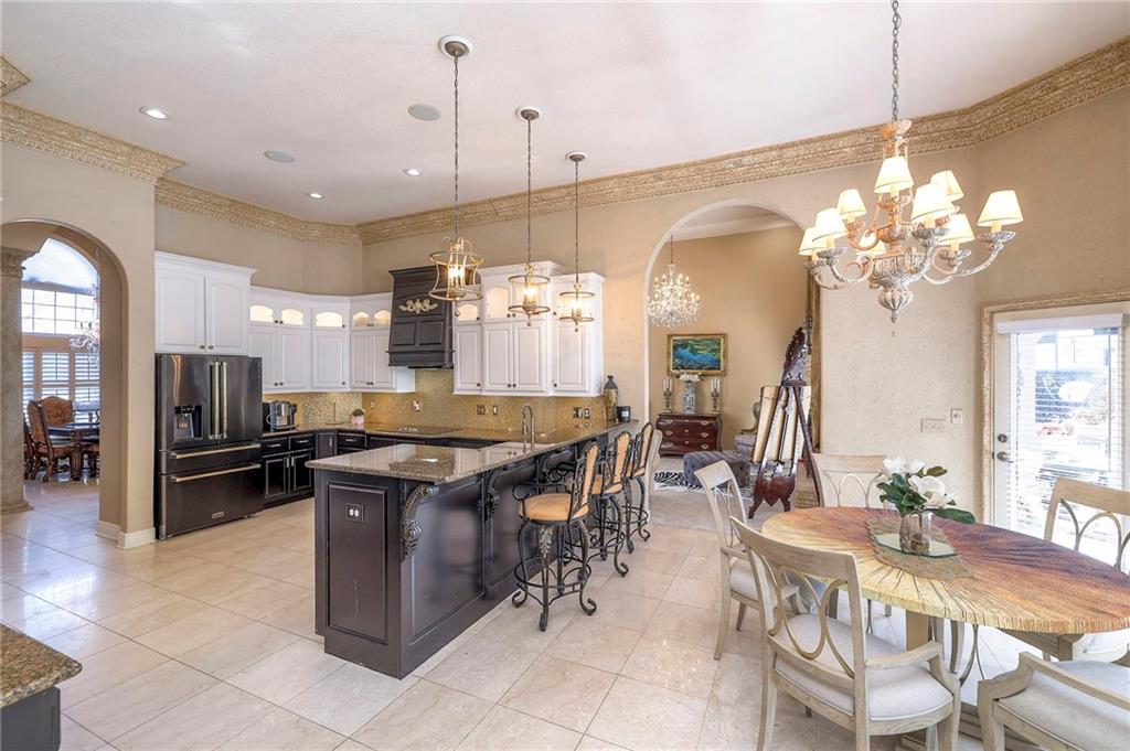 This stunning 6,000+ sq ft reverse story-and-a-half residence blends timeless elegance with refined European flair, offering luxury, comfort, and exceptional design at every turn. Featuring 5 spacious bedrooms and 4 full baths plus a powder room (4.1 baths), the home is thoughtfully designed for both everyday living and grand entertaining. The main level showcases expansive living areas with beautiful tile floors, soaring ceilings, and abundant natural light. The gourmet kitchen is appointed with rich granite countertops, custom cabinetry, premium appliances, and generous workspace—perfect for hosting or preparing family meals in style. The reverse story-and-a-half layout places the luxurious primary suite and key living spaces on the main level, while the lower level opens to additional bedrooms, recreation space, and a full secondary kitchen—ideal for multi-generational living, guest quarters, or extended entertaining. The lower level also features a dedicated media room, creating the ultimate private theater experience for movie nights and game days. Architectural details throughout the home reflect classic European influences, from elegant finishes and refined textures to graceful design lines that add warmth and sophistication. With its expansive square footage, high-end finishes, and versatile living spaces, this exceptional home offers both grandeur and functionality—perfect for those who appreciate luxury with distinctive European character.