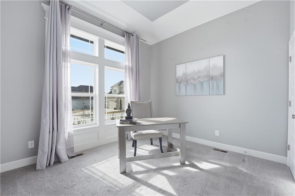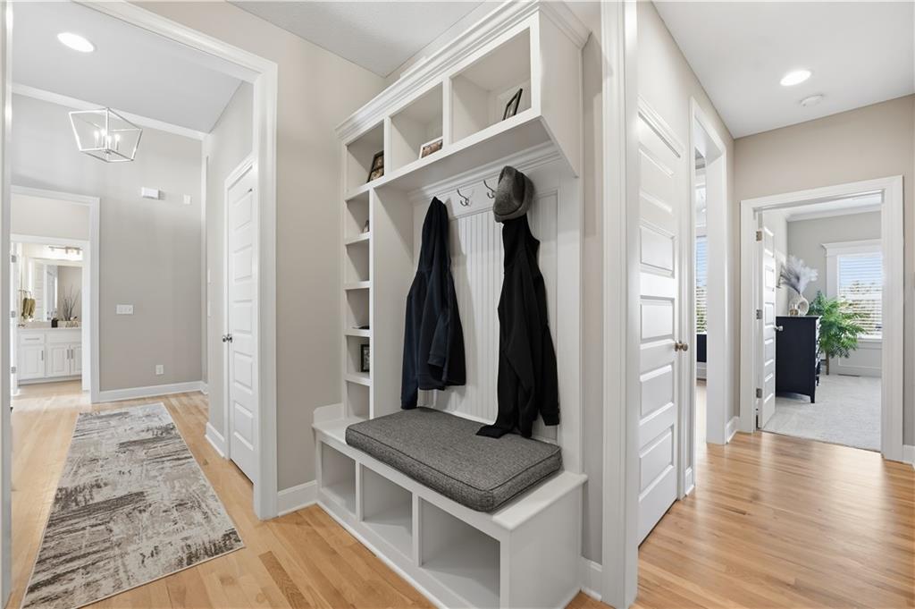 The popular James Engle Emory plan is quality built with 2x6 frame. This home offers a beautiful front elevation and a functional layout. Set on a cul-de-sac, this nearly new home sits high on a hill facing south, with a landscaped island and a fenced yard backing to green space. Double doors open to a light and bright interior featuring a main-floor primary suite plus an additional bedroom with a full bath-perfect for guests or a home office. The kitchen includes a spacious island, tall cabinetry, and a contemporary design ideal for everyday living and entertaining. Upstairs offers two bedrooms with private, ensuite baths and a loft. Relax outdoors on the screened porch overlooking green space. The garage is prepped for EV charging. This neighborhood truly has it all to create new friendships with extensive amenities including a club house, pickle ball courts, trails, pool and play area.