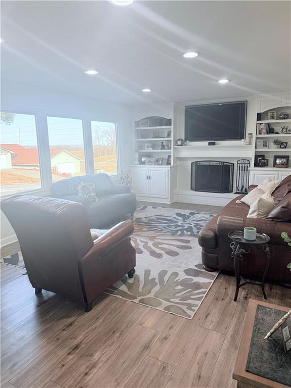 Beautifully remodeled raised ranch in Country Club Village-Andrew County & Savannah School district! Welcome home to this 3-bedroom ranch located in the conveniently located neighborhood of Andrew County. This quiet horseshoe street is just .3 miles from John Glenn Elementary School and only a 12-minute drive to Savannah High School-making it an ideal location if you are looking to get into the Savannah School District. This move-in ready home features a bright eat-in kitchen with ample cabinet space, and a Pella sliding door that opens to a spacious deck. The living room offers custom-built bookshelves & cabinets, along with a wood burning fireplace and a built-in insert for a flat screen TV (included) and surround sound. The primary bedroom includes French doors that open to the deck, which spans the entire length of the home and overlooks a beautifully designed backyard entertainment area complete with a brick patio and built-in firepit-perfect for gatherings and relaxing evenings. A long driveway provides plenty of parking and creates a large, safe area for kids or pets to play, ride bikes or shoot hoops. The newly carpeted finished recreation room adds even more living space and includes another fireplace, built-in cabinets with a sink, and a small refrigerator-ideal for entertaining. An electronics cabinet, stereo system and outdoor Bose speakers extend the fun to the screened-in patio area. Also located on the lower level are the laundry room and third full bathroom (washer & dryer stay). The two-car garage includes a workbench and space for an additional refrigerator and/or freezer. Recent upgrades include new windows and LVP throughout. All your shopping and dining needs are just 1.3 miles to the North shopping area. This home offers comfort, convenience and outstanding indoor & outdoor living-don't miss your opportunity to make it yours!