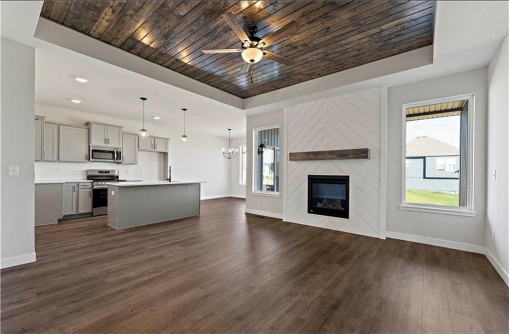 MOVE IN READY, MAY 2026. Welcome to The Kinley in Woodhaven! This spacious 3-bedroom, 2-bath ranch sits on one of the community’s premium lots, backing to beautiful greenspace and walking trails. Enjoy added privacy from your covered deck—perfect for relaxing or entertaining. The open-concept kitchen features quartz countertops, a large center island, walk-in pantry, and luxury vinyl plank flooring that flows throughout most of the main living areas. Bedrooms offer comfortable carpeting, creating a warm and inviting retreat. This home truly has it all with thoughtful design and quality finishes throughout. Woodhaven is one of the fastest-growing communities in Platte County, offering incredible future amenities including a pool, play area, walking trails, covered pavilion, and pickleball courts.
