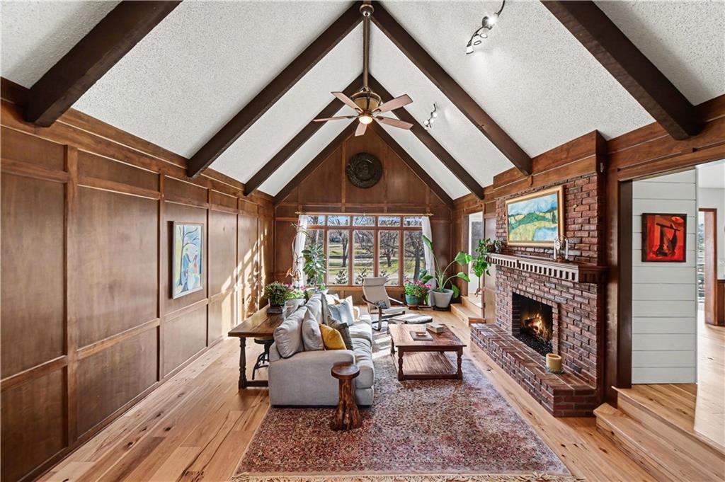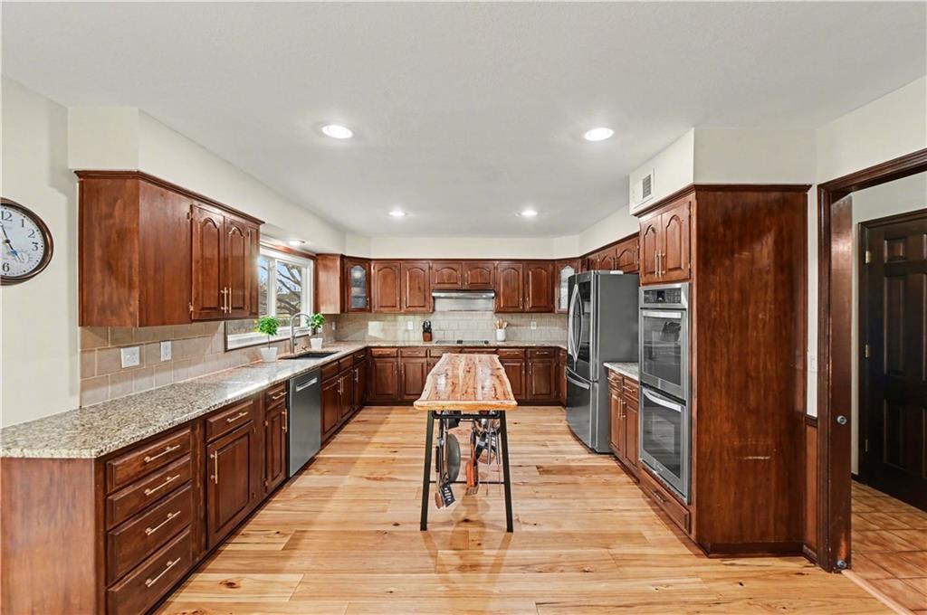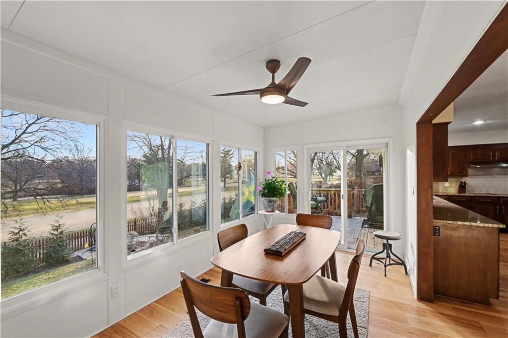 Stunning 1.5-story estate offering 4 bedrooms, 4.1 baths, a 2 car garage, and nearly 5,600 square feet, perfectly positioned on over half a acre lot along the golf course at Blue Springs Country Club. From the moment you arrive, the charming front entry welcomes you into a light-filled home designed to impress. Soaring ceilings with striking wood beams elevate the living room, where a beautiful fireplace anchors the space and walls of windows frame breathtaking golf course views. Just off the entry, a private main-level office provides the ideal work-from-home setting. The open-concept kitchen features granite countertops, abundant cabinetry, and flows seamlessly into a sunlit eat-in area/sunroom that opens onto the upper deck. Do not miss the laundry and mud room that is off the oversized garage. The main level also features a spacious primary suite with a beautifully updated spa-like bath, complete with double vanities, soaking tub, and walk-in closet. An additional bedroom and full bath are located on the main floor. Upstairs, you’ll find two oversized bedrooms and a full bath, offering comfort and privacy for family or guests.The walkout lower level is an entertainer’s dream and not to be overlooked. Enjoy a massive family room with bar area, dedicated exercise room, all-seasons room, full bath, fifth non-conforming bedroom, and even a 3rd garage with two workshop spaces — ideal for hobbyists or extra storage. The meticulously landscaped yard is truly exceptional, featuring an upper-level sitting deck, lower-level patio, and established vegetable gardens ready for the next growing season. This home has been impeccably maintained updated with fresh interior paint, refinished hardwood floors, new lighting, an updated primary bath, and more. A rare opportunity to own a golf course retreat that combines elegance, comfort, and functionality — this is a home you must experience to truly appreciate.