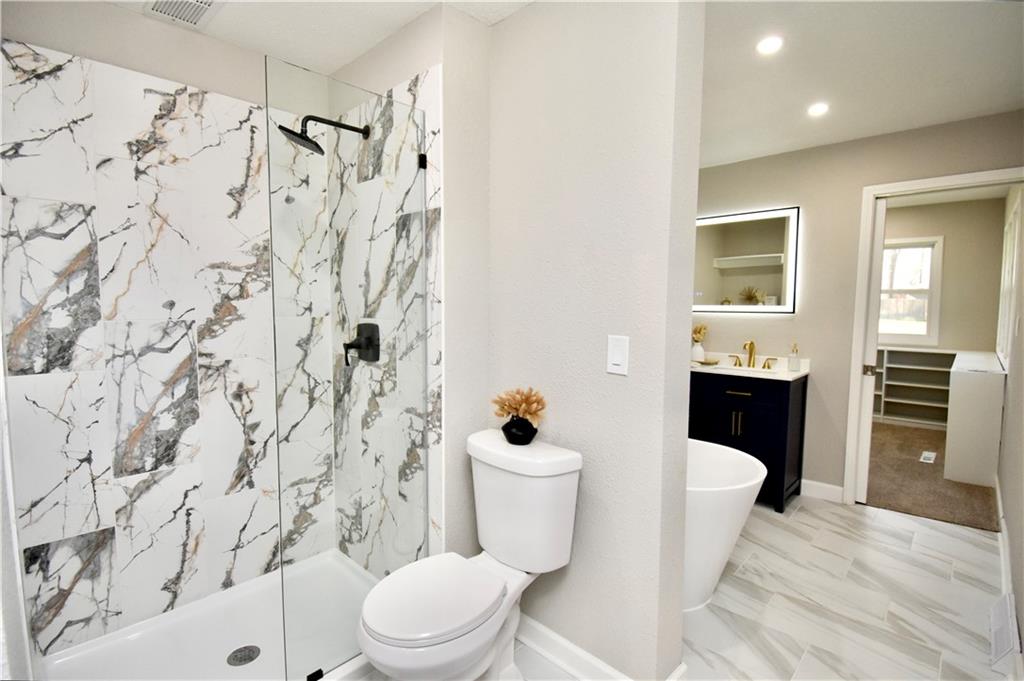 Complete renovated Reverse 1.5 Story offering main level living, spa-like primary suite, and finished walk-out basement on nearly half an acre! If you have viewed this one before, STAY!! Seller took property off market & completed enhancements you will love!! This home also offers main level living with 3 bedrooms and 3 full bathrooms on the MAIN FLOOR—a RARE find. The redesigned primary suite includes a spa-like bathroom, double vanity, LED backlit mirror, walk-in tiled shower, freestanding soaking tub, custom built-ins, and a large walk-in closet. Additionally seller replace LVP flooring on the main level with hybrid wood flooring, and new carpet in bedrooms. The fully remodeled kitchen features new cabinetry, quartz countertops, large island w/cooktop, double oven, pantry, abundance of counter space especially for entertaining! Open concept living room/hearth room with fireplace, abundant natural light, and modern finishes throughout. All new interior doors, trim, hardware, lighting, and ceiling fans. Finished walk-out basement expands living space large rec room, wet bar, second fireplace, additional bedroom, full bathroom, & walk-in laundry room with built-ins. Unique hidden room behind built-in bookcase adds flexible bonus space! Exterior features - covered patio, new deck, nearly ½ acre lot, and partial privacy fence. Major updates: new roof, new garage door, new driveway, fresh interior & exterior paint. This beautiful modern home is Turnkey/ Move-in ready. Prime location w/quick highway access, aprox 15 minutes to downtown, 30 mins to KCI Airport, 20 minutes to Chiefs/Royals Stadium. Close to OP shopping & dining. Shawnee Mission School District. HIGHLIGHTS INCLUDE- Complete Interior Renovation- Turnkey Ready- Reverse 1.5 Story- Main Level w/3 Bedrooms & 3 Full Bathrooms- Primary En-Suite- Finished Walk-Out Basement, Wet Bar- New Garage Door, Driveway, Partial Fence- New Roof- Great Location-Easy Commute!